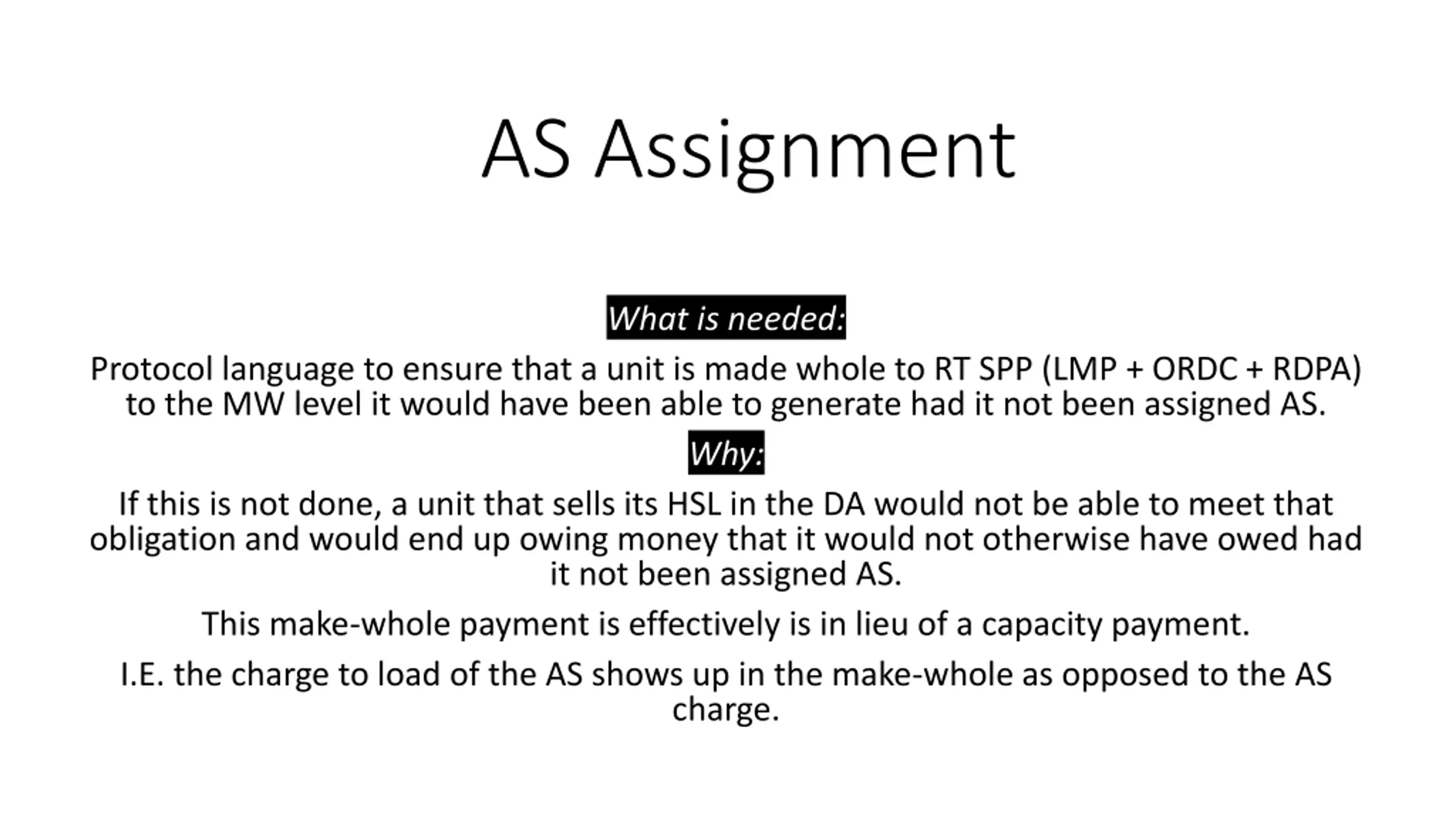 AS Assignment What is needed: Protocol language to ensure that a unit is made whole to RT SPP (LMP + ORDC + RDPA) to the MW level it would have been able to generate had it not been assigned AS. Why: If this is not done, a unit that sells its HSL in the DA would not be able to meet that obligation and would end up owing money that it would not otherwise have owed had it not been assigned AS. This make-whole payment is effectively is in lieu of a capacity payment. I.E. the charge to load of the AS shows up in the make-whole as opposed to the AS charge.