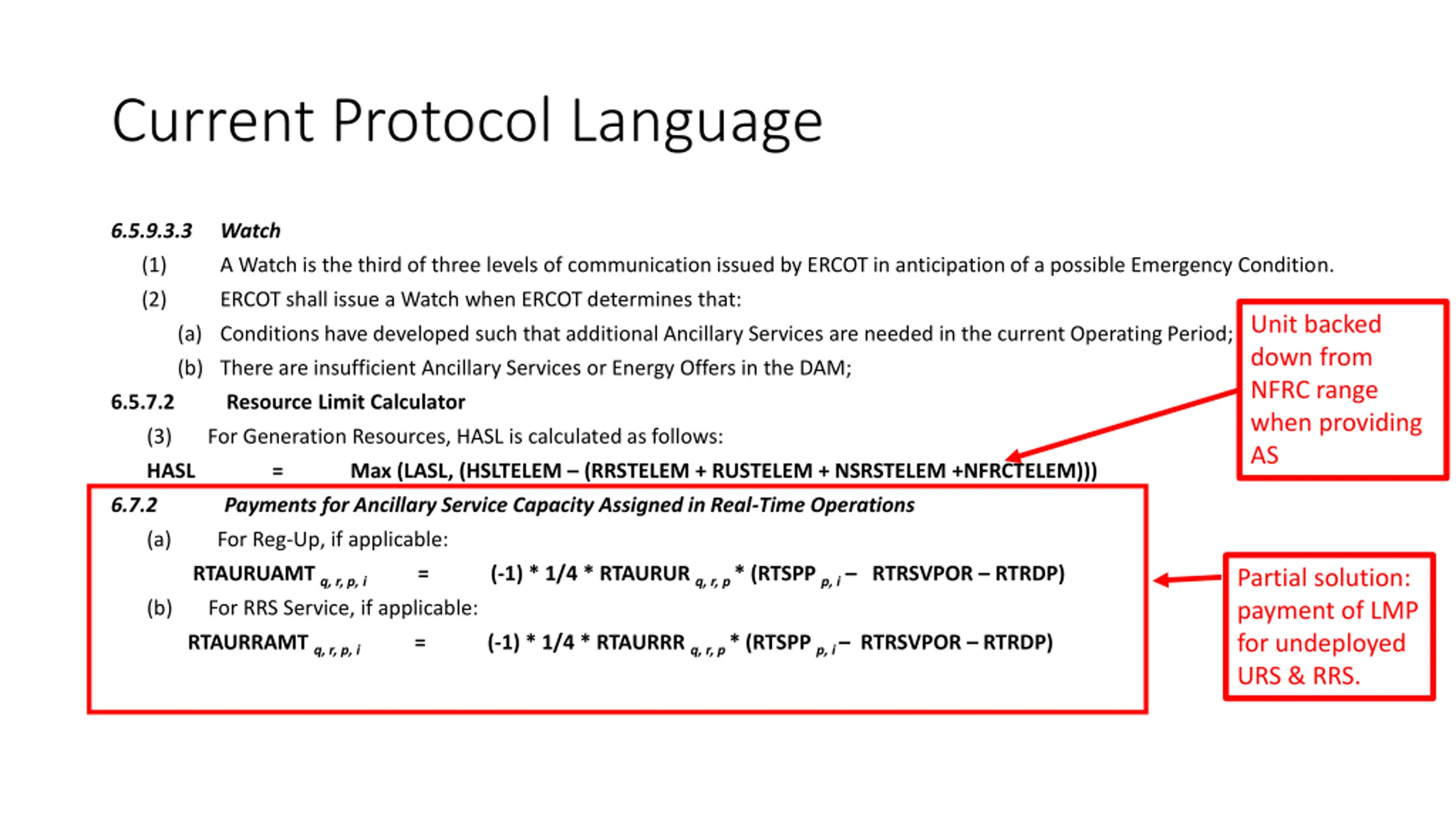 Current Protocol Language 6.5.9.3.3 Watch (1) A Watch is the third of three levels of communication issued by ERCOT in anticipation of a possible Emergency Condition. (2) ERCOT shall issue a Watch when ERCOT determines that: Unit backed down from NFRC range when providing AS (a) Conditions have developed such that additional Ancillary Services are needed in the current Operating Period; (b) There are insufficient Ancillary Services or Energy Offers in the DAM; 6.5.7.2 Resource Limit Calculator (3) For Generation Resources, HASL is calculated as follows: HASL = Max (LASL, (HSLTELEM (RRSTELEM + RUSTELEM + NSRSTELEM +NFRCTELEM))) 6.7.2 Payments for Ancillary Service Capacity Assigned in Real-Time Operations (a) For Reg-Up, if applicable: RTAURUAMT q, r, p, i For RRS Service, if applicable: = (-1) * 1/4 * RTAURUR q, r, p * (RTSPP p, i RTRSVPOR RTRDP) Partial solution: payment of LMP for undeployed URS & RRS. (b) RTAURRAMT q, r, p, i = (-1) * 1/4 * RTAURRR q, r, p * (RTSPP p, i RTRSVPOR RTRDP)