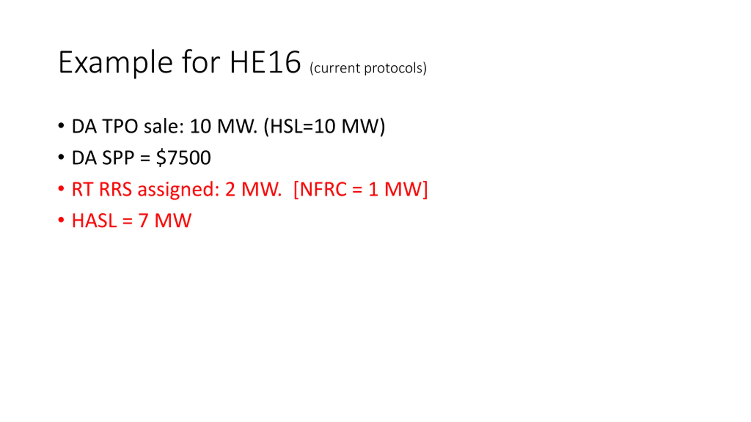 Example for HE16 (current protocols) DA TPO sale: 10 MW. (HSL=10 MW) DA SPP = $7500 RT RRS assigned: 2 MW. [NFRC = 1 MW] HASL = 7 MW