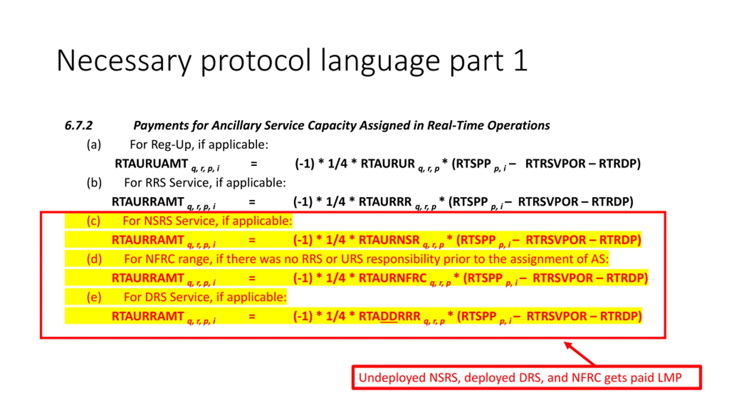 Necessary protocol language part 1 6.7.2 (a) RTAURUAMT q, r, p, i (b) For RRS Service, if applicable: RTAURRAMT q, r, p, i (c) For NSRS Service, if applicable: RTAURRAMT q, r, p, i (d) For NFRC range, if there was no RRS or URS responsibility prior to the assignment of AS: RTAURRAMT q, r, p, i = (-1) * 1/4 * RTAURNFRC q, r, p * (RTSPP p, i RTRSVPOR RTRDP) (e) For DRS Service, if applicable: RTAURRAMT q, r, p, i = (-1) * 1/4 * RTADDRRR q, r, p * (RTSPP p, i RTRSVPOR RTRDP) Payments for Ancillary Service Capacity Assigned in Real-Time Operations For Reg-Up, if applicable: (-1) * 1/4 * RTAURUR q, r, p * (RTSPP p, i RTRSVPOR RTRDP) = = (-1) * 1/4 * RTAURRR q, r, p * (RTSPP p, i RTRSVPOR RTRDP) = (-1) * 1/4 * RTAURNSR q, r, p * (RTSPP p, i RTRSVPOR RTRDP) Undeployed NSRS, deployed DRS, and NFRC gets paid LMP