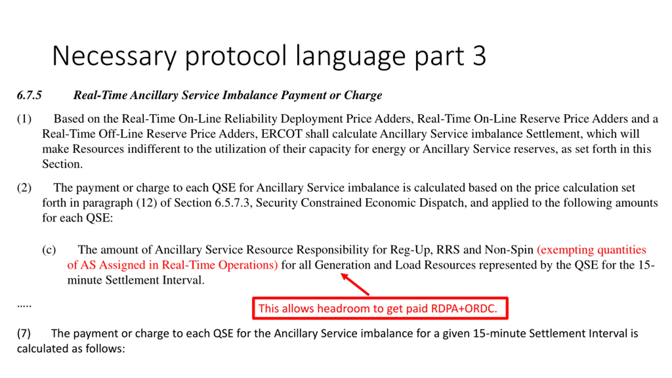 Necessary protocol language part 3 6.7.5 Real-Time Ancillary Service Imbalance Payment or Charge (1) Based on the Real-Time On-Line Reliability Deployment Price Adders, Real-Time On-Line Reserve Price Adders and a Real-Time Off-Line Reserve Price Adders, ERCOT shall calculate Ancillary Service imbalance Settlement, which will make Resources indifferent to the utilization of their capacity for energy or Ancillary Service reserves, as set forth in this Section. (2) The payment or charge to each QSE for Ancillary Service imbalance is calculated based on the price calculation set forth in paragraph (12) of Section 6.5.7.3, Security Constrained Economic Dispatch, and applied to the following amounts for each QSE: (c) The amount of Ancillary Service Resource Responsibility for Reg-Up, RRS and Non-Spin (exempting quantities of AS Assigned in Real-Time Operations) for all Generation and Load Resources represented by the QSE for the 15- minute Settlement Interval. .. This allows headroom to get paid RDPA+ORDC. (7) calculated as follows: The payment or charge to each QSE for the Ancillary Service imbalance for a given 15-minute Settlement Interval is