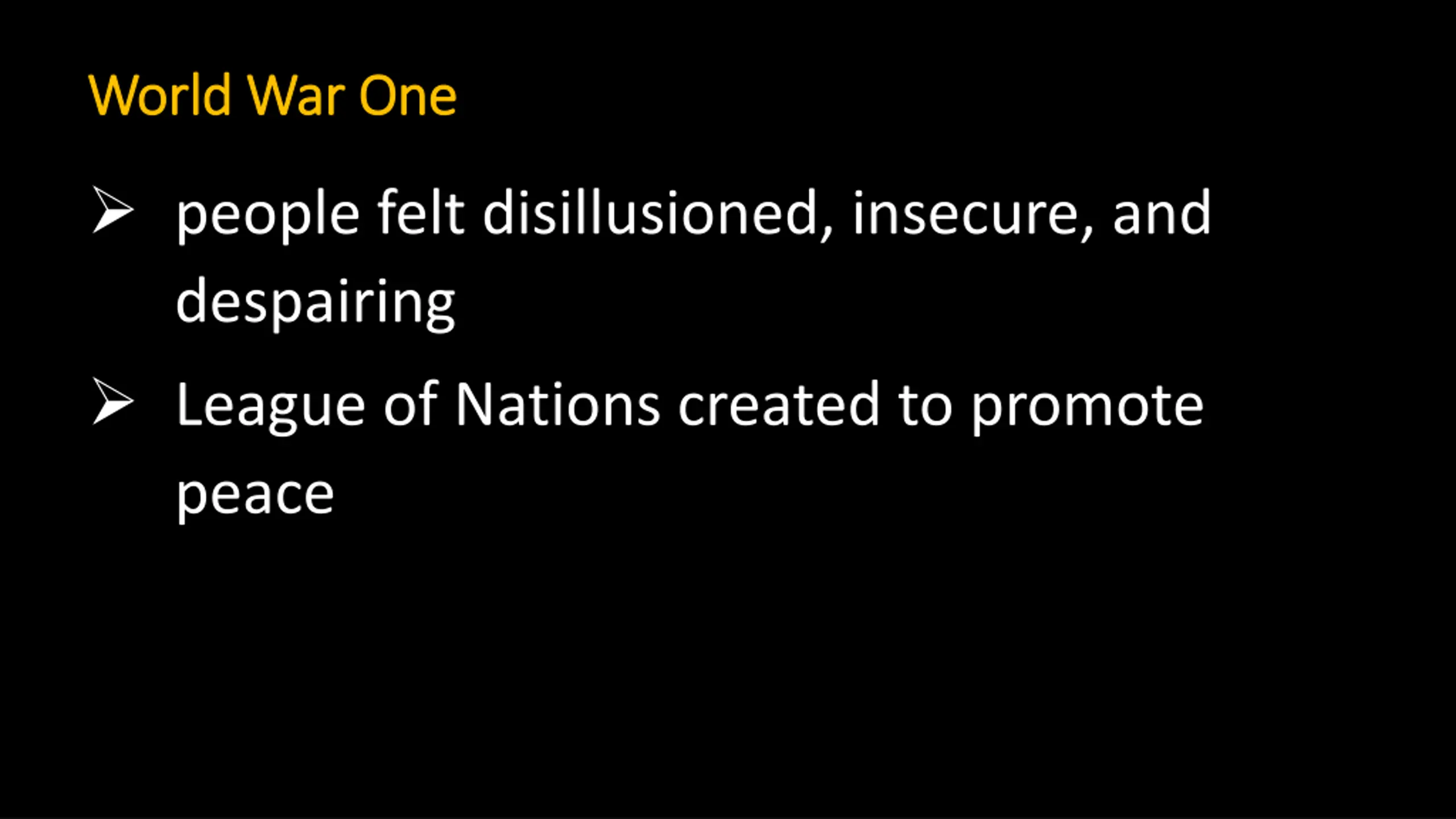 World War One World War One people felt disillusioned, insecure, and despairing League of Nations created to promote peace
