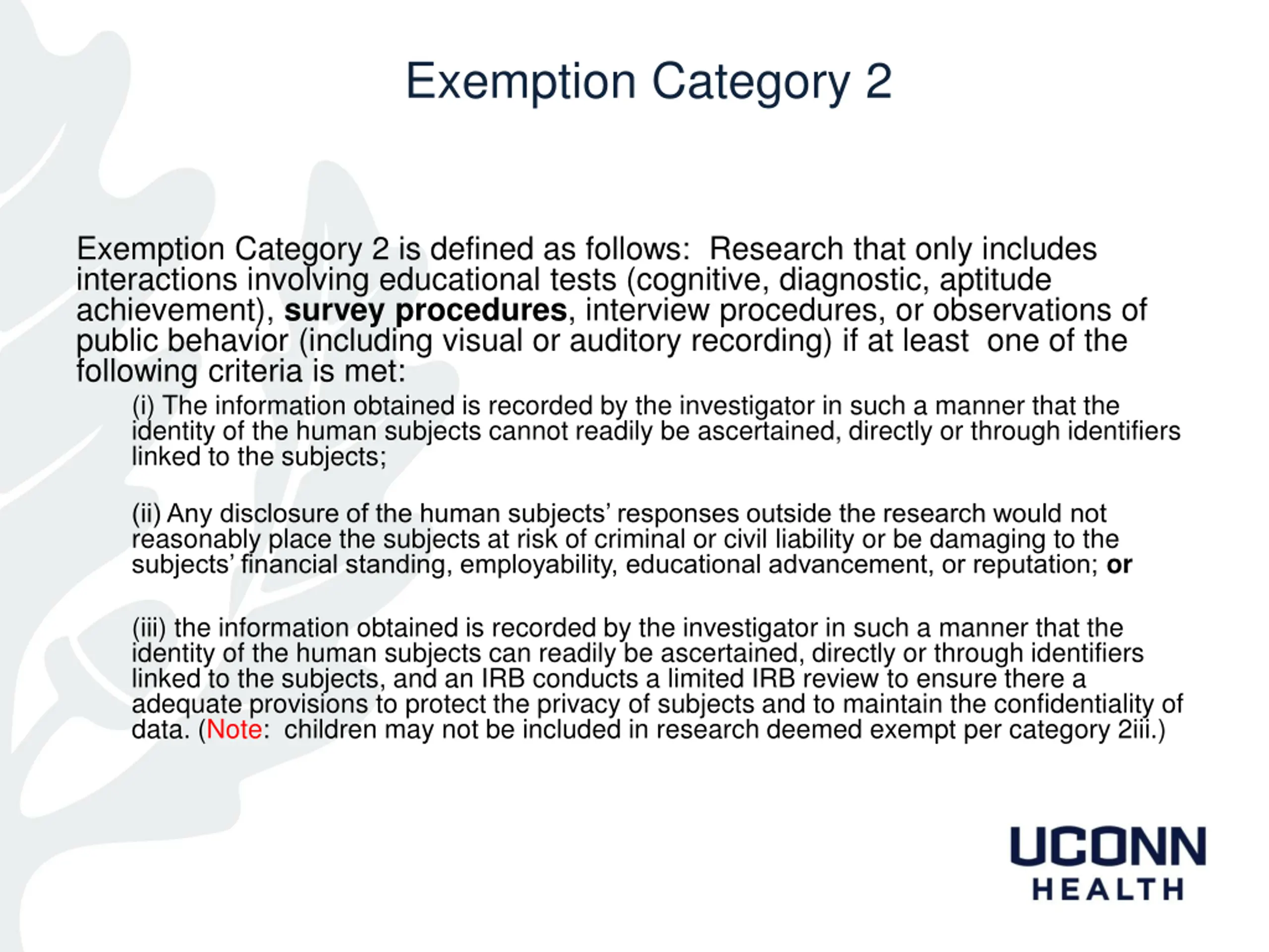 Exemption Category 2 Exemption Category 2 is defined as follows: Research that only includes interactions involving educational tests (cognitive, diagnostic, aptitude achievement), survey procedures, interview procedures, or observations of public behavior (including visual or auditory recording) if at least one of the following criteria is met: (i) The information obtained is recorded by the investigator in such a manner that the identity of the human subjects cannot readily be ascertained, directly or through identifiers linked to the subjects; (ii) Any disclosure of the human subjects responses outside the research would not reasonably place the subjects at risk of criminal or civil liability or be damaging to the subjects financial standing, employability, educational advancement, or reputation; or (iii) the information obtained is recorded by the investigator in such a manner that the identity of the human subjects can readily be ascertained, directly or through identifiers linked to the subjects, and an IRB conducts a limited IRB review to ensure there a adequate provisions to protect the privacy of subjects and to maintain the confidentiality of data. (Note: children may not be included in research deemed exempt per category 2iii.)