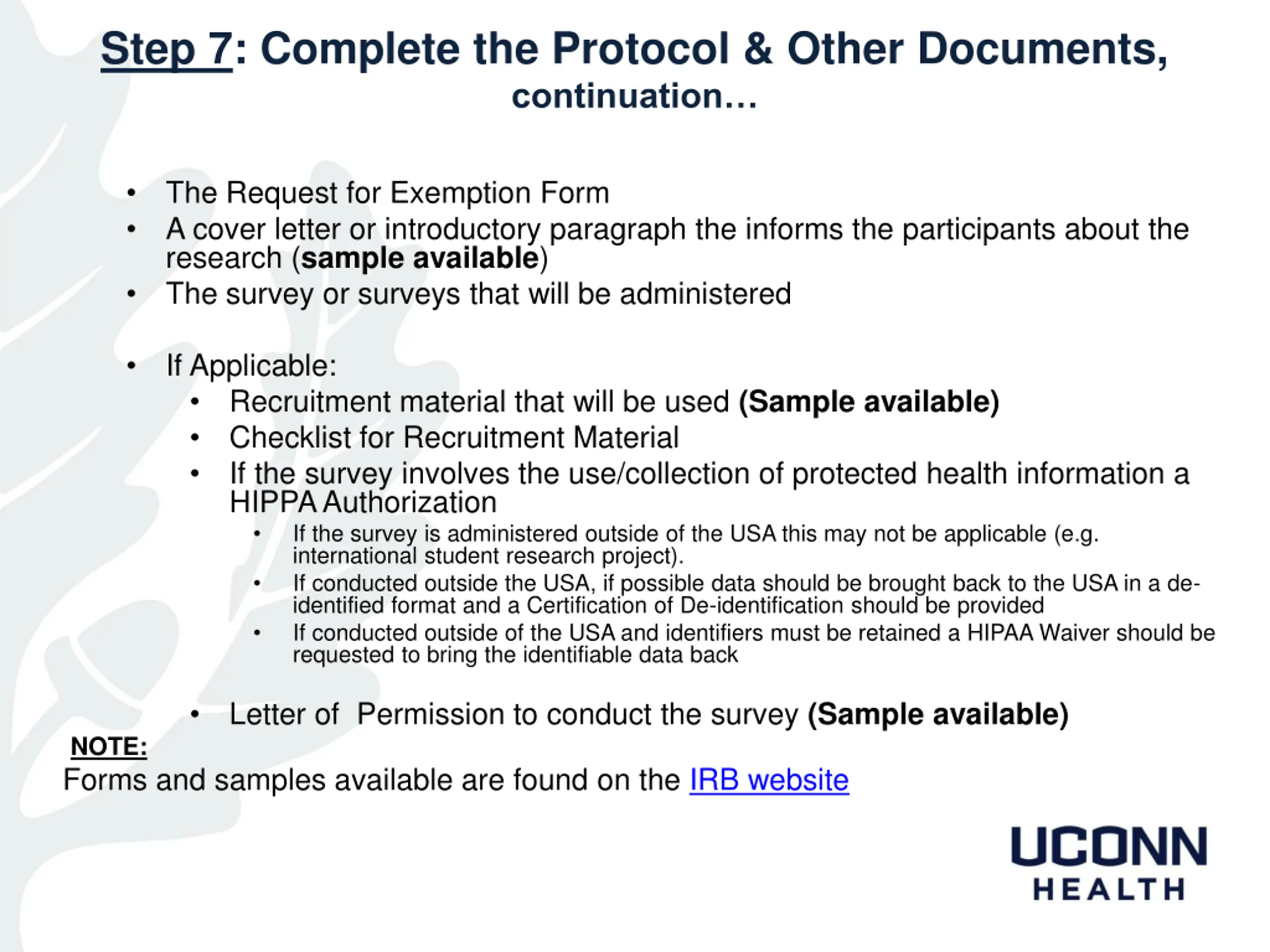 Step 7: Complete the Protocol & Other Documents, continuation The Request for Exemption Form A cover letter or introductory paragraph the informs the participants about the research (sample available) The survey or surveys that will be administered If Applicable: Recruitment material that will be used (Sample available) Checklist for Recruitment Material If the survey involves the use/collection of protected health information a HIPPA Authorization If the survey is administered outside of the USA this may not be applicable (e.g. international student research project). If conducted outside the USA, if possible data should be brought back to the USA in a de- identified format and a Certification of De-identification should be provided If conducted outside of the USA and identifiers must be retained a HIPAA Waiver should be requested to bring the identifiable data back Letter of Permission to conduct the survey (Sample available) NOTE: Forms and samples available are found on the IRB website