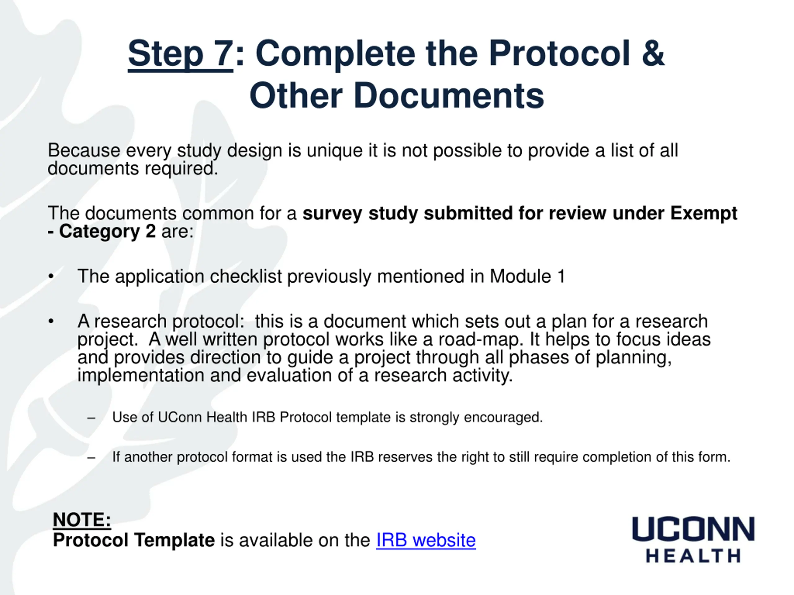 Step 7: Complete the Protocol & Other Documents Because every study design is unique it is not possible to provide a list of all documents required. The documents common for a survey study submitted for review under Exempt - Category 2 are: The application checklist previously mentioned in Module 1 A research protocol: this is a document which sets out a plan for a research project. A well written protocol works like a road-map. It helps to focus ideas and provides direction to guide a project through all phases of planning, implementation and evaluation of a research activity. Use of UConn Health IRB Protocol template is strongly encouraged. If another protocol format is used the IRB reserves the right to still require completion of this form. NOTE: Protocol Template is available on the IRB website
