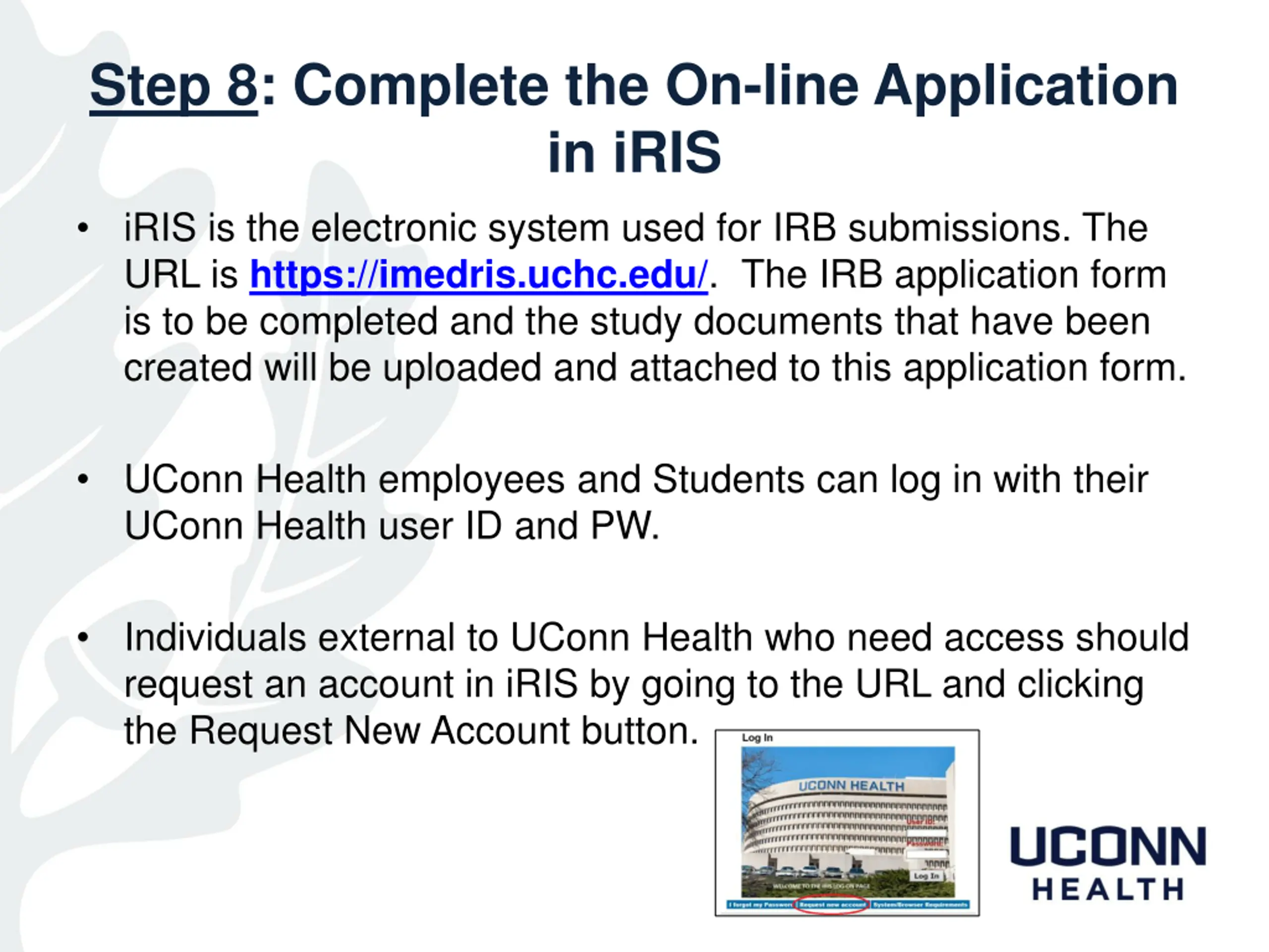 Step 8: Complete the On-line Application in iRIS iRIS is the electronic system used for IRB submissions. The URL is https://imedris.uchc.edu/. The IRB application form is to be completed and the study documents that have been created will be uploaded and attached to this application form. UConn Health employees and Students can log in with their UConn Health user ID and PW. Individuals external to UConn Health who need access should request an account in iRIS by going to the URL and clicking the Request New Account button.