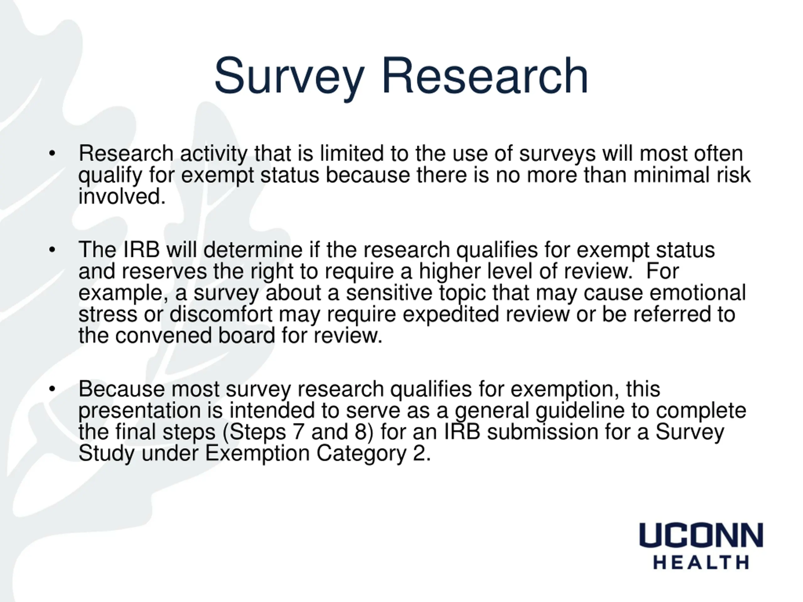 Survey Research Research activity that is limited to the use of surveys will most often qualify for exempt status because there is no more than minimal risk involved. The IRB will determine if the research qualifies for exempt status and reserves the right to require a higher level of review. For example, a survey about a sensitive topic that may cause emotional stress or discomfort may require expedited review or be referred to the convened board for review. Because most survey research qualifies for exemption, this presentation is intended to serve as a general guideline to complete the final steps (Steps 7 and 8) for an IRB submission for a Survey Study under Exemption Category 2.