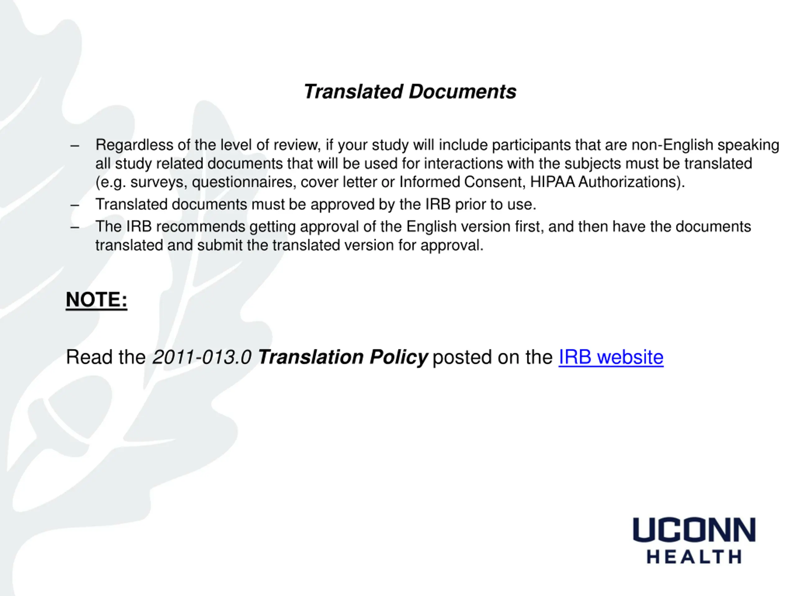 Translated Documents Regardless of the level of review, if your study will include participants that are non-English speaking all study related documents that will be used for interactions with the subjects must be translated (e.g. surveys, questionnaires, cover letter or Informed Consent, HIPAA Authorizations). Translated documents must be approved by the IRB prior to use. The IRB recommends getting approval of the English version first, and then have the documents translated and submit the translated version for approval. NOTE: Read the 2011-013.0 Translation Policy posted on the IRB website