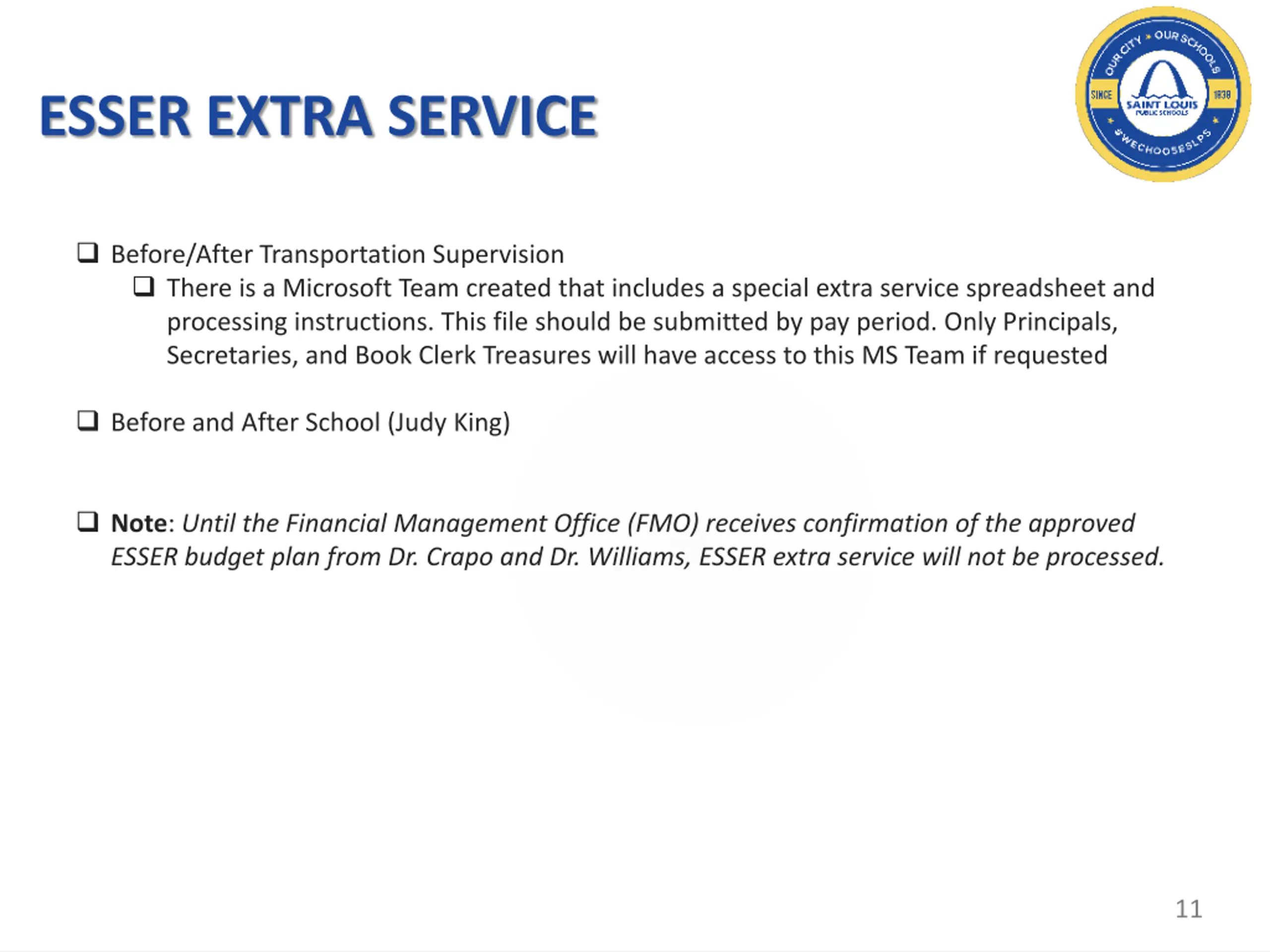 ESSER EXTRA SERVICE Before/After Transportation Supervision There is a Microsoft Team created that includes a special extra service spreadsheet and processing instructions. This file should be submitted by pay period. Only Principals, Secretaries, and Book Clerk Treasures will have access to this MS Team if requested Before and After School (Judy King) Note: Until the Financial Management Office (FMO) receives confirmation of the approved ESSER budget plan from Dr. Crapo and Dr. Williams, ESSER extra service will not be processed.