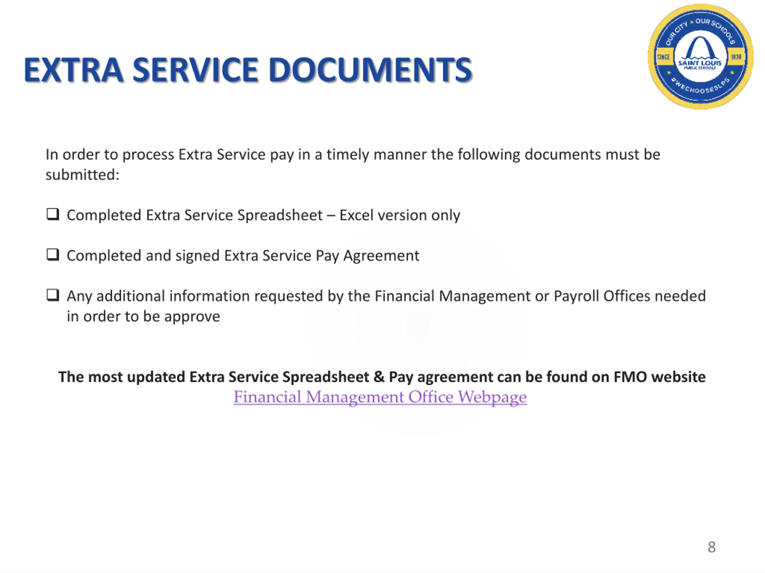EXTRA SERVICE DOCUMENTS In order to process Extra Service pay in a timely manner the following documents must be submitted: Completed Extra Service Spreadsheet Excel version only Completed and signed Extra Service Pay Agreement Any additional information requested by the Financial Management or Payroll Offices needed in order to be approve The most updated Extra Service Spreadsheet & Pay agreement can be found on FMO website Financial Management Office Webpage