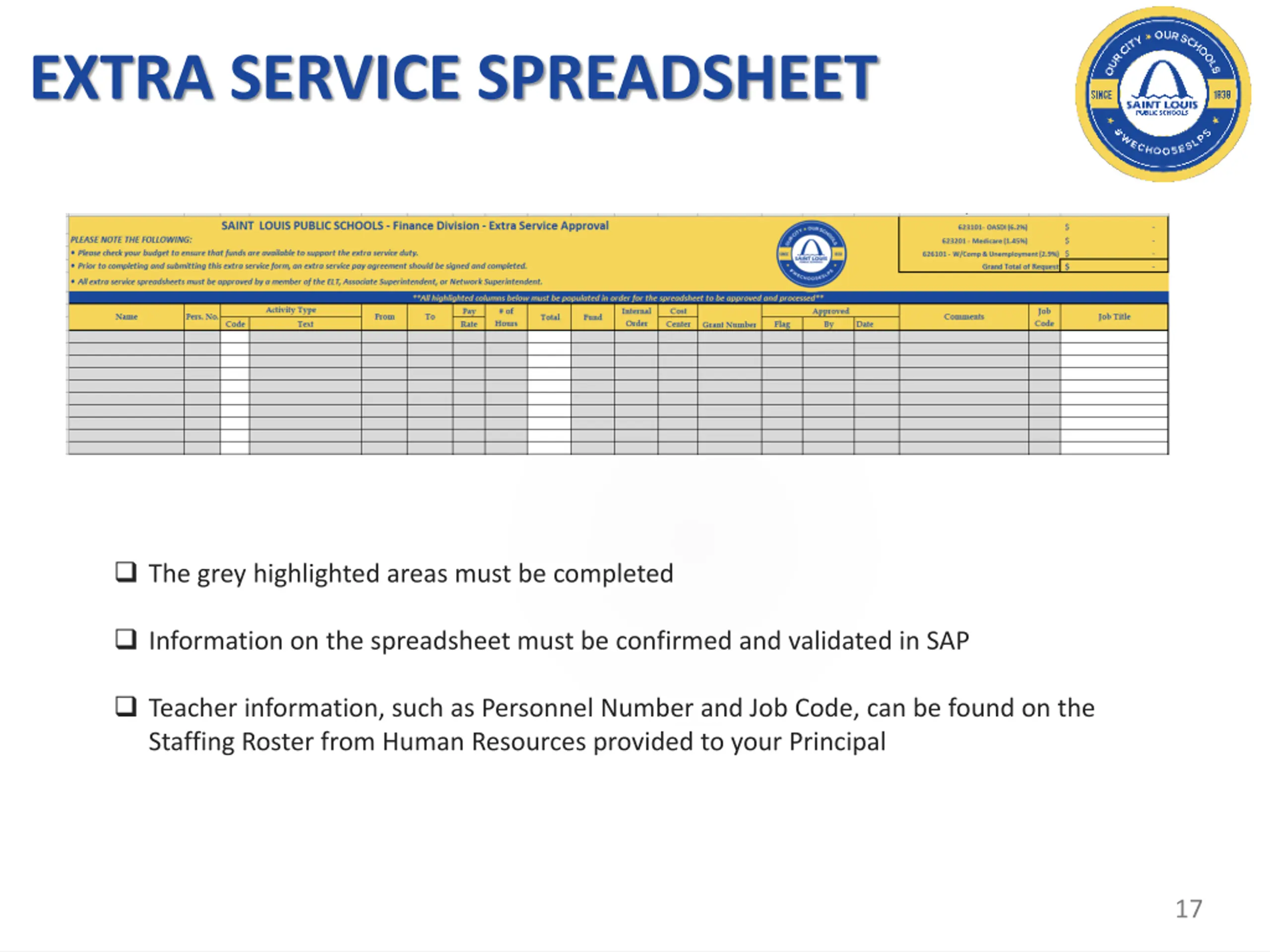 EXTRA SERVICE SPREADSHEET The grey highlighted areas must be completed Information on the spreadsheet must be confirmed and validated in SAP Teacher information, such as Personnel Number and Job Code, can be found on the Staffing Roster from Human Resources provided to your Principal
