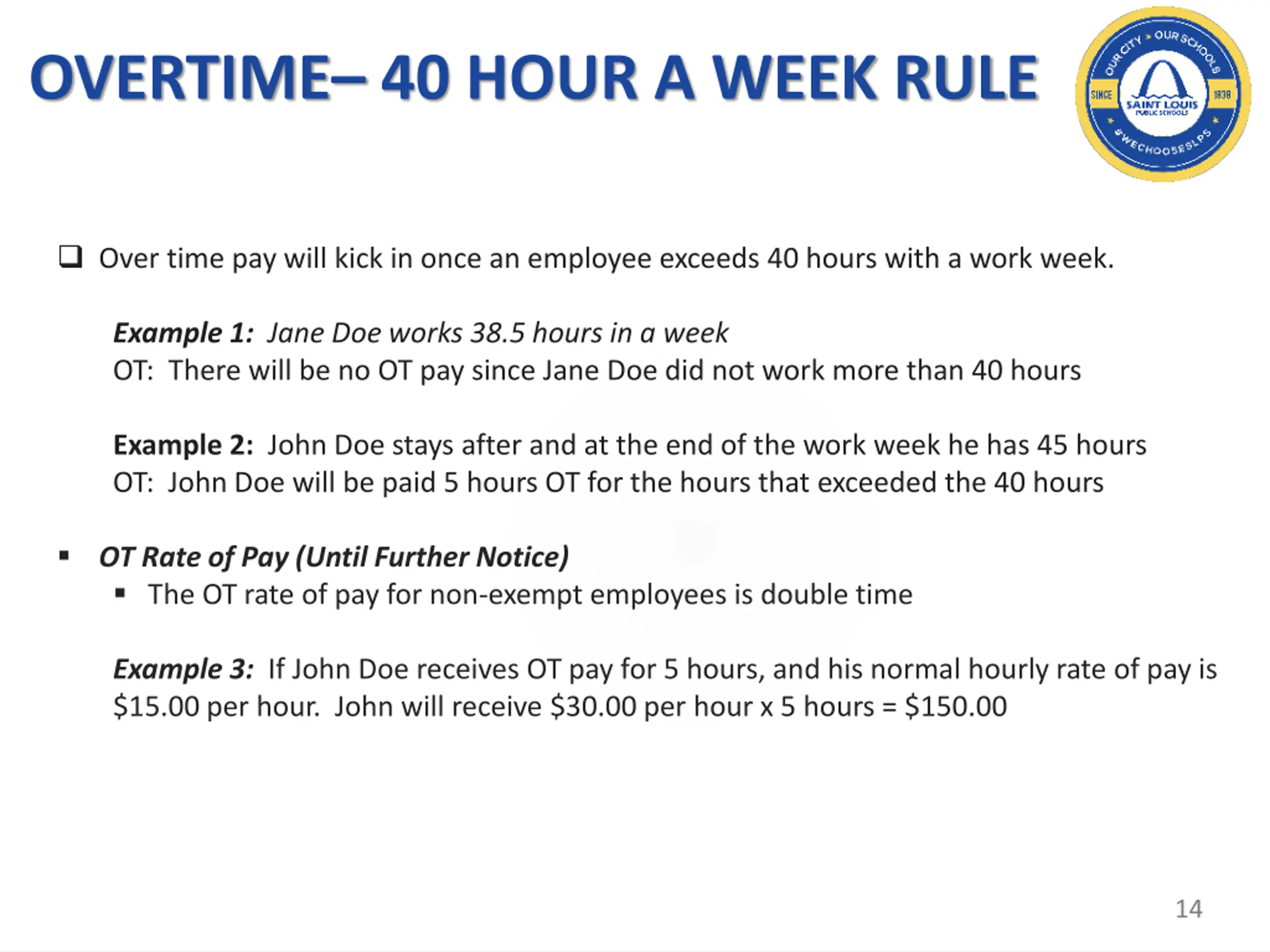 OVERTIME 40 HOUR A WEEK RULE Over time pay will kick in once an employee exceeds 40 hours with a work week. Example 1: Jane Doe works 38.5 hours in a week OT: There will be no OT pay since Jane Doe did not work more than 40 hours Example 2: John Doe stays after and at the end of the work week he has 45 hours OT: John Doe will be paid 5 hours OT for the hours that exceeded the 40 hours OT Rate of Pay (Until Further Notice) The OT rate of pay for non-exempt employees is double time Example 3: If John Doe receives OT pay for 5 hours, and his normal hourly rate of pay is $15.00 per hour. John will receive $30.00 per hour x 5 hours = $150.00