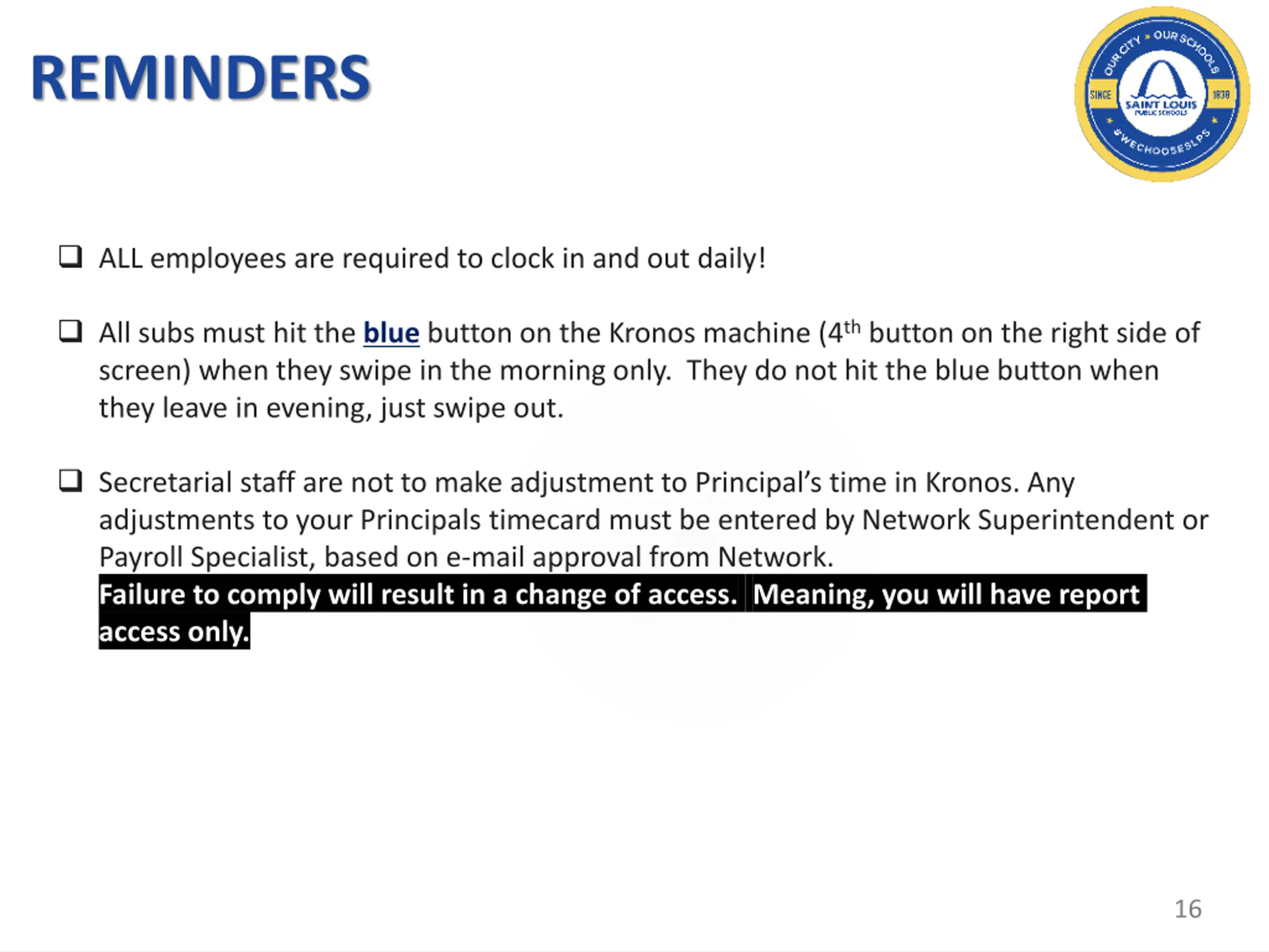 REMINDERS ALL employees are required to clock in and out daily! All subs must hit the blue button on the Kronos machine (4thbutton on the right side of screen) when they swipe in the morning only. They do not hit the blue button when they leave in evening, just swipe out. Secretarial staff are not to make adjustment to Principal s time in Kronos. Any adjustments to your Principals timecard must be entered by Network Superintendent or Payroll Specialist, based on e-mail approval from Network. Failure to comply will result in a change of access. Meaning, you will have report access only.