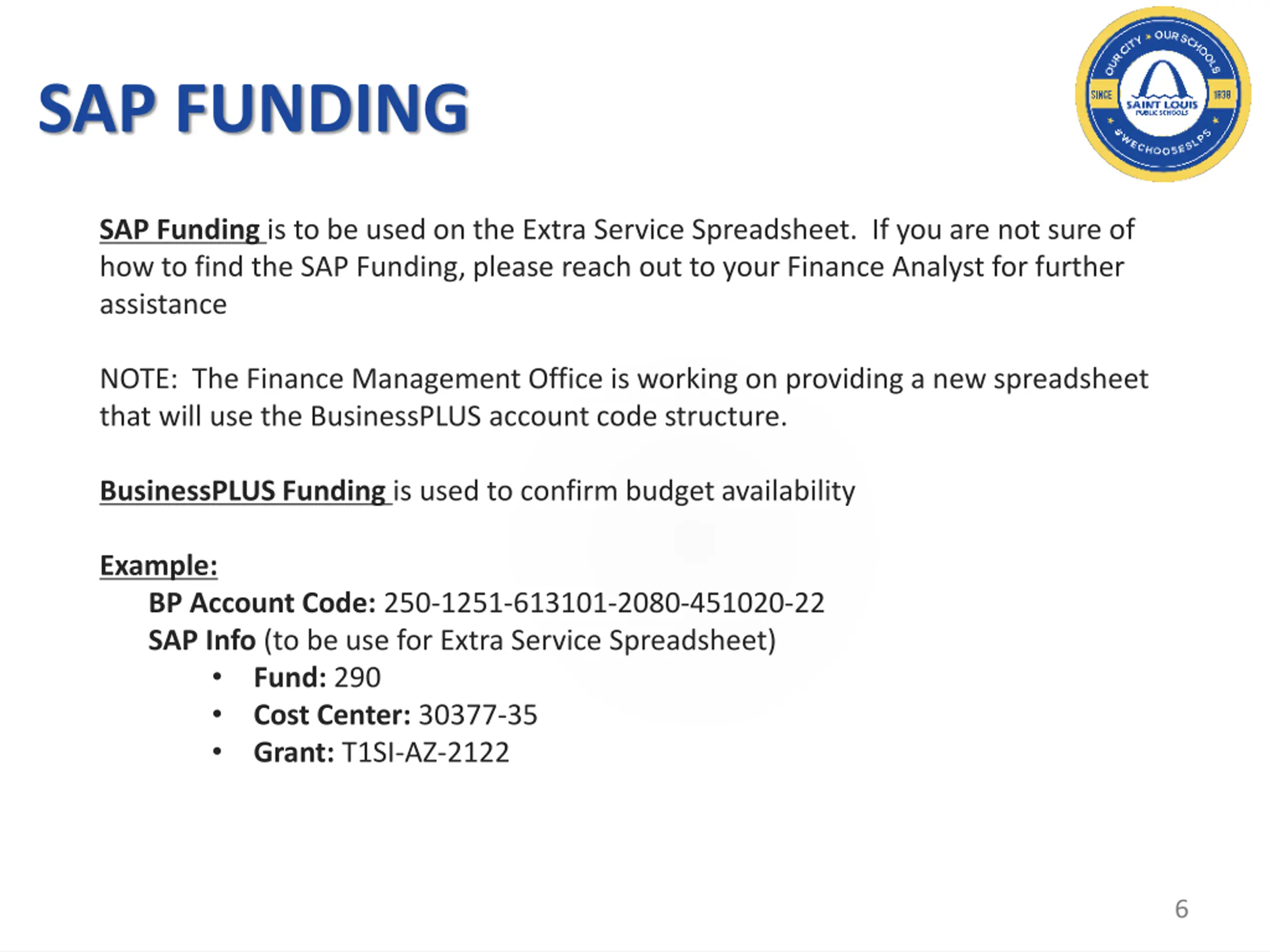 SAP FUNDING SAP Funding is to be used on the Extra Service Spreadsheet. If you are not sure of how to find the SAP Funding, please reach out to your Finance Analyst for further assistance NOTE: The Finance Management Office is working on providing a new spreadsheet that will use the BusinessPLUS account code structure. BusinessPLUS Funding is used to confirm budget availability Example: BP Account Code: 250-1251-613101-2080-451020-22 SAP Info (to be use for Extra Service Spreadsheet) Fund: 290 Cost Center: 30377-35 Grant: T1SI-AZ-2122