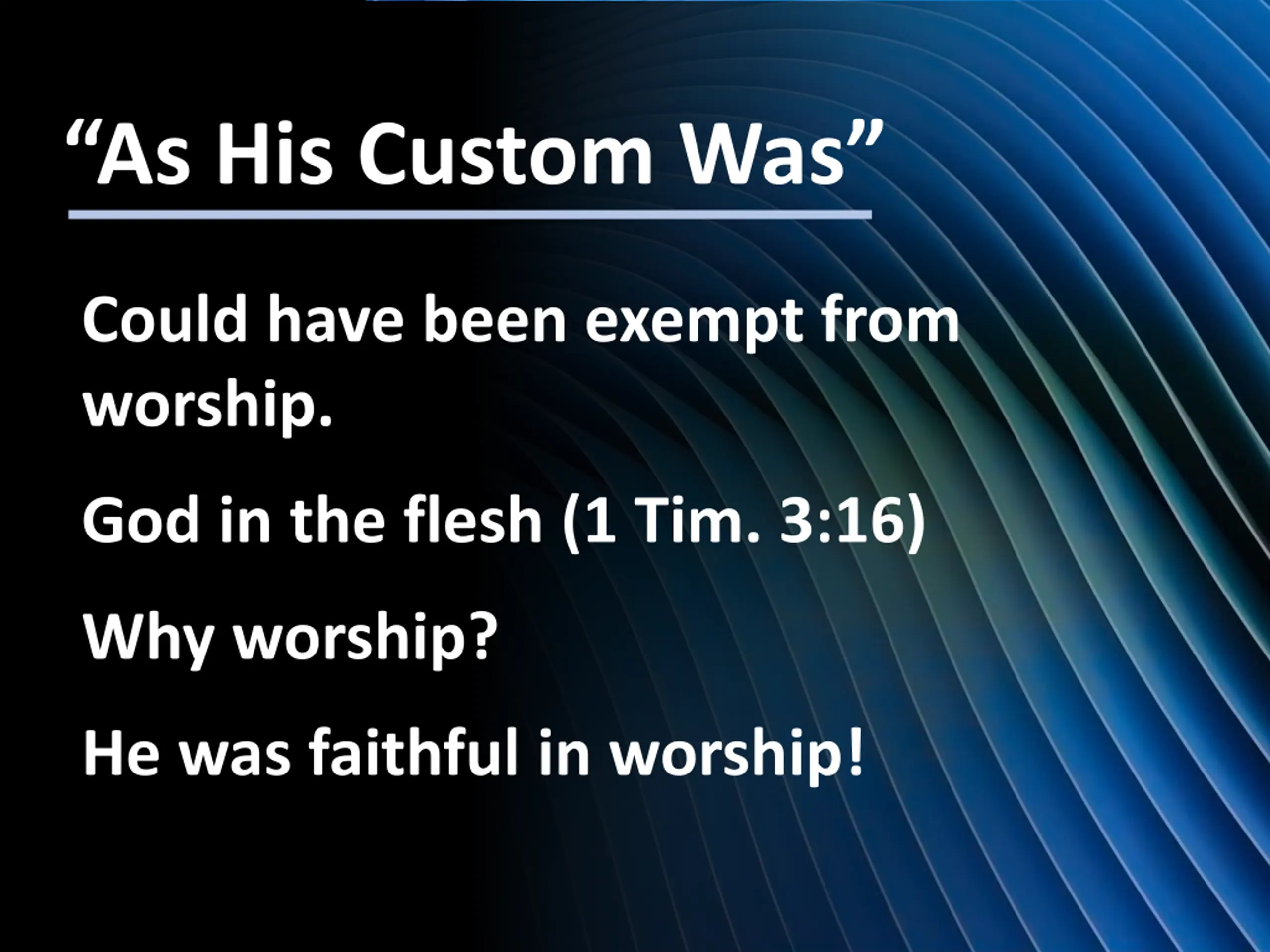 As His Custom Was Could have been exempt from worship. God in the flesh (1 Tim. 3:16) Why worship? He was faithful in worship!