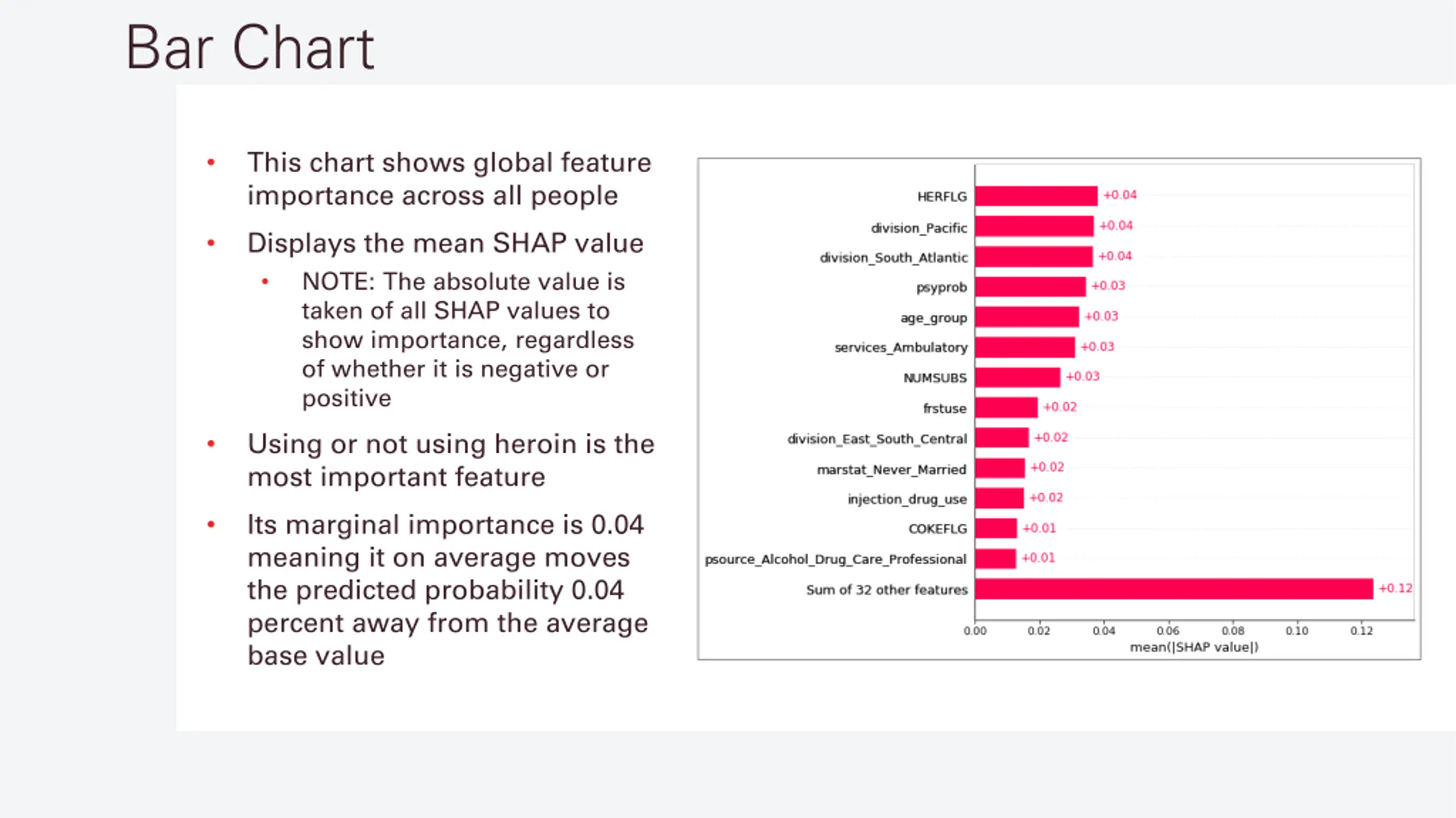 Bar Chart This chart shows global feature importance across all people Displays the mean SHAP value NOTE: The absolute value is taken of all SHAP values to show importance, regardless of whether it is negative or positive Using or not using heroin is the most important feature Its marginal importance is 0.04 meaning it on average moves the predicted probability 0.04 percent away from the average base value
