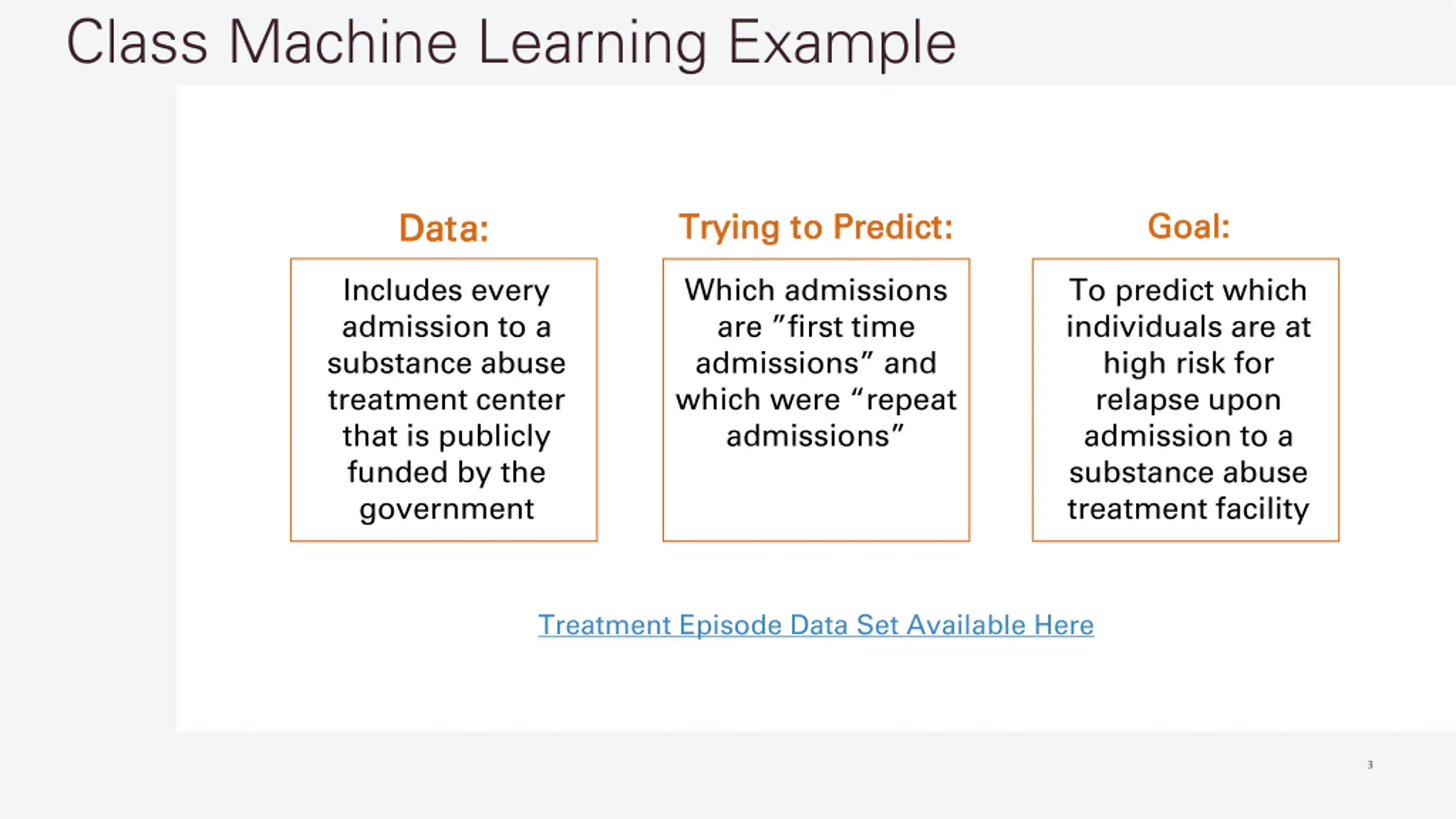 Class Machine Learning Example Data: Data: Goal: Goal: Trying to Predict: Trying to Predict: Includes every admission to a substance abuse treatment center that is publicly funded by the government Which admissions are first time admissions and which were repeat admissions To predict which individuals are at high risk for relapse upon admission to a substance abuse treatment facility Treatment Episode Data Set Available Here 3