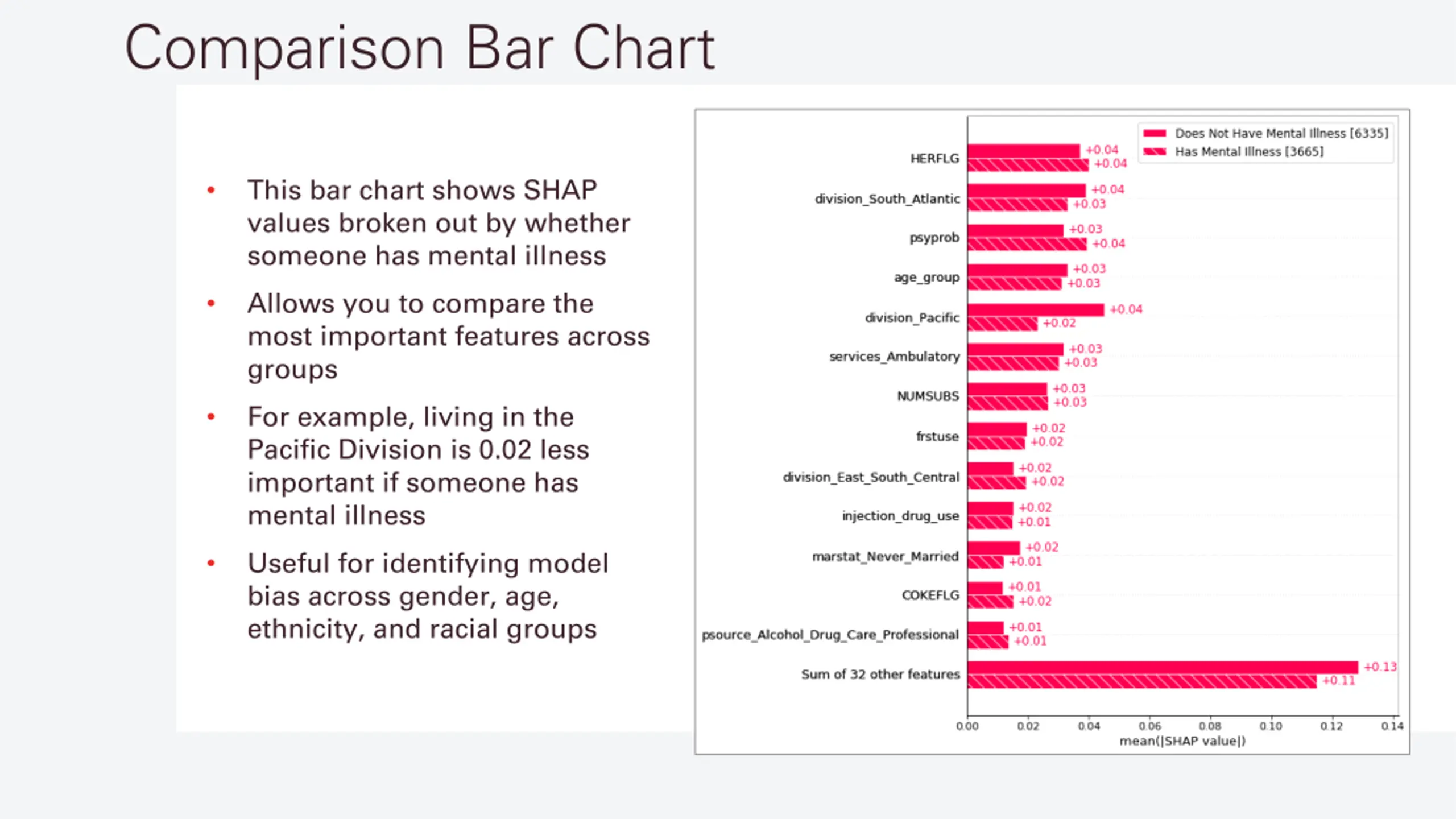 Comparison Bar Chart This bar chart shows SHAP values broken out by whether someone has mental illness Allows you to compare the most important features across groups For example, living in the Pacific Division is 0.02 less important if someone has mental illness Useful for identifying model bias across gender, age, ethnicity, and racial groups
