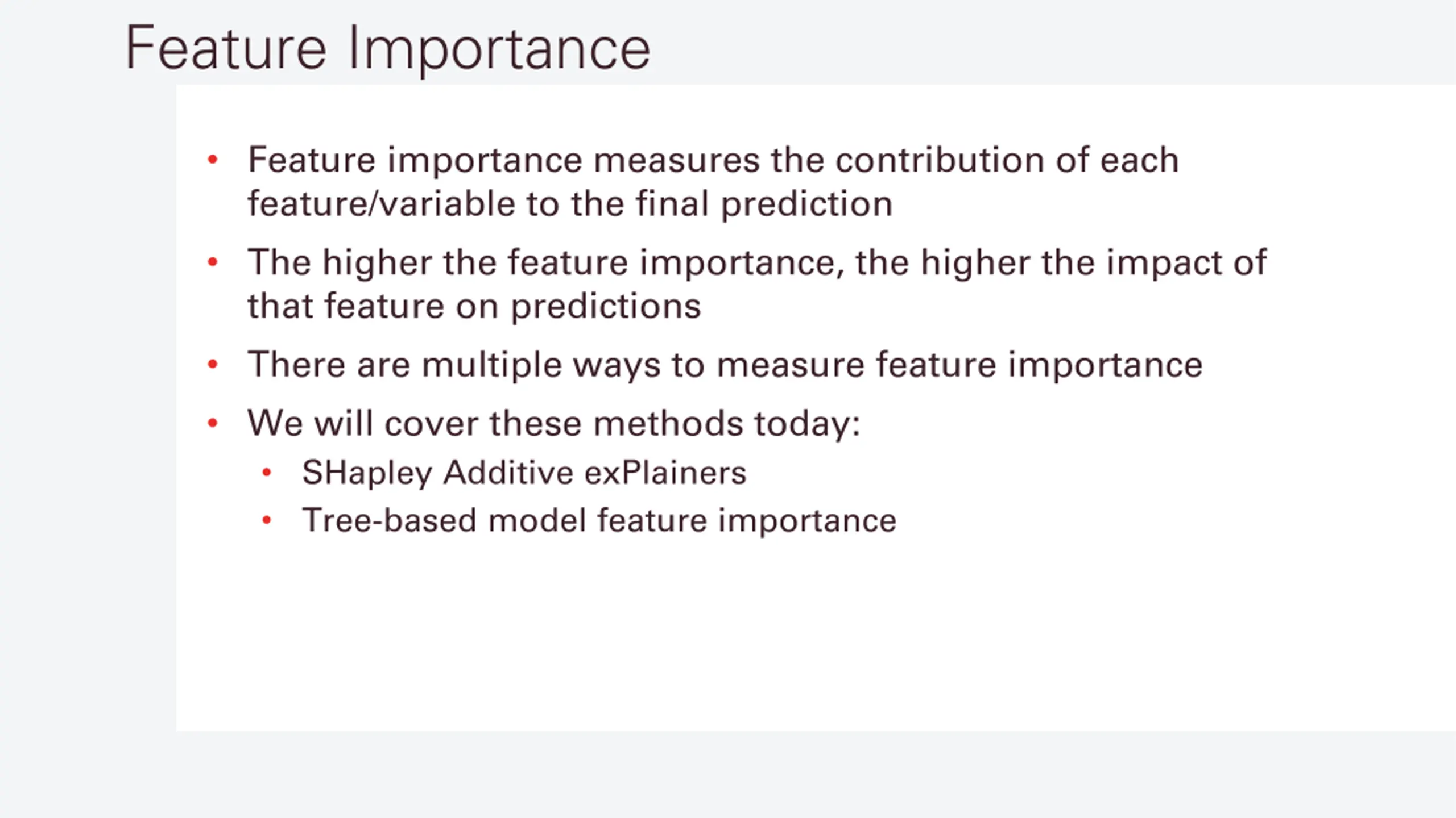 Feature Importance Feature importance measures the contribution of each feature/variable to the final prediction The higher the feature importance, the higher the impact of that feature on predictions There are multiple ways to measure feature importance We will cover these methods today: SHapley Additive exPlainers Tree-based model feature importance