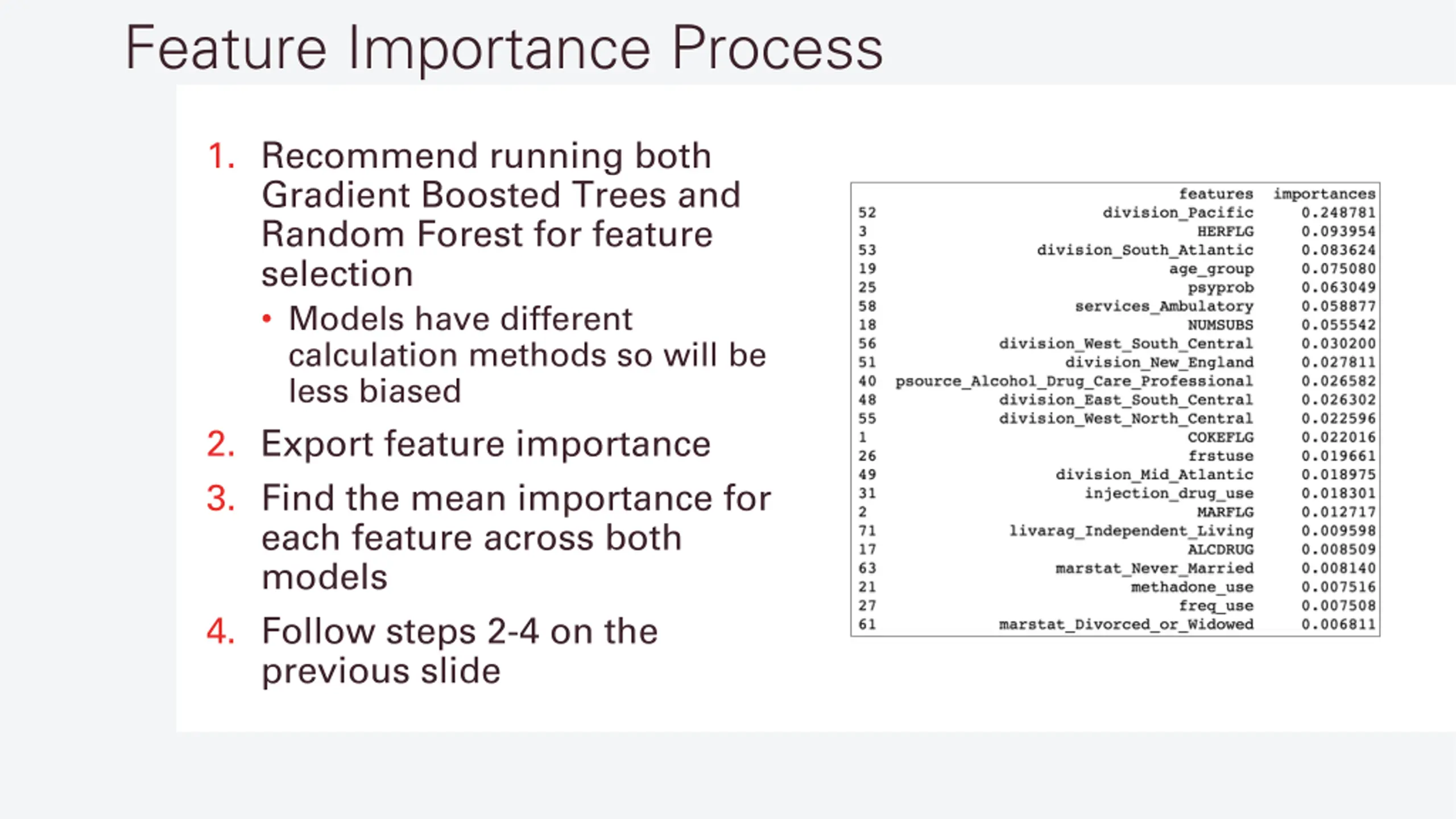 Feature Importance Process 1. Recommend running both Gradient Boosted Trees and Random Forest for feature selection Models have different calculation methods so will be less biased 2. Export feature importance 3. Find the mean importance for each feature across both models 4. Follow steps 2-4 on the previous slide
