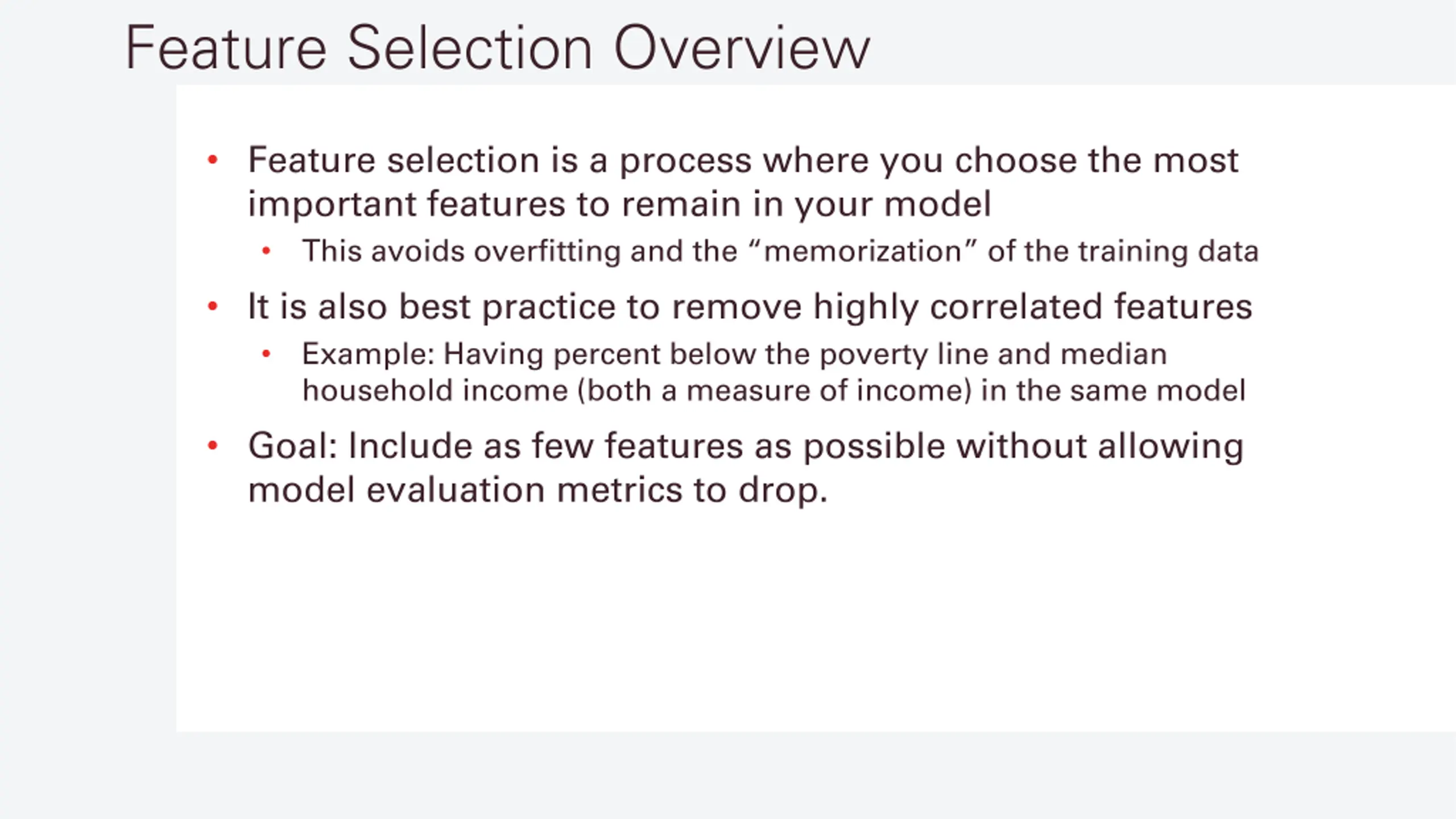 Feature Selection Overview Feature selection is a process where you choose the most important features to remain in your model This avoids overfitting and the memorization of the training data It is also best practice to remove highly correlated features Example: Having percent below the poverty line and median household income (both a measure of income) in the same model Goal: Include as few features as possible without allowing model evaluation metrics to drop.
