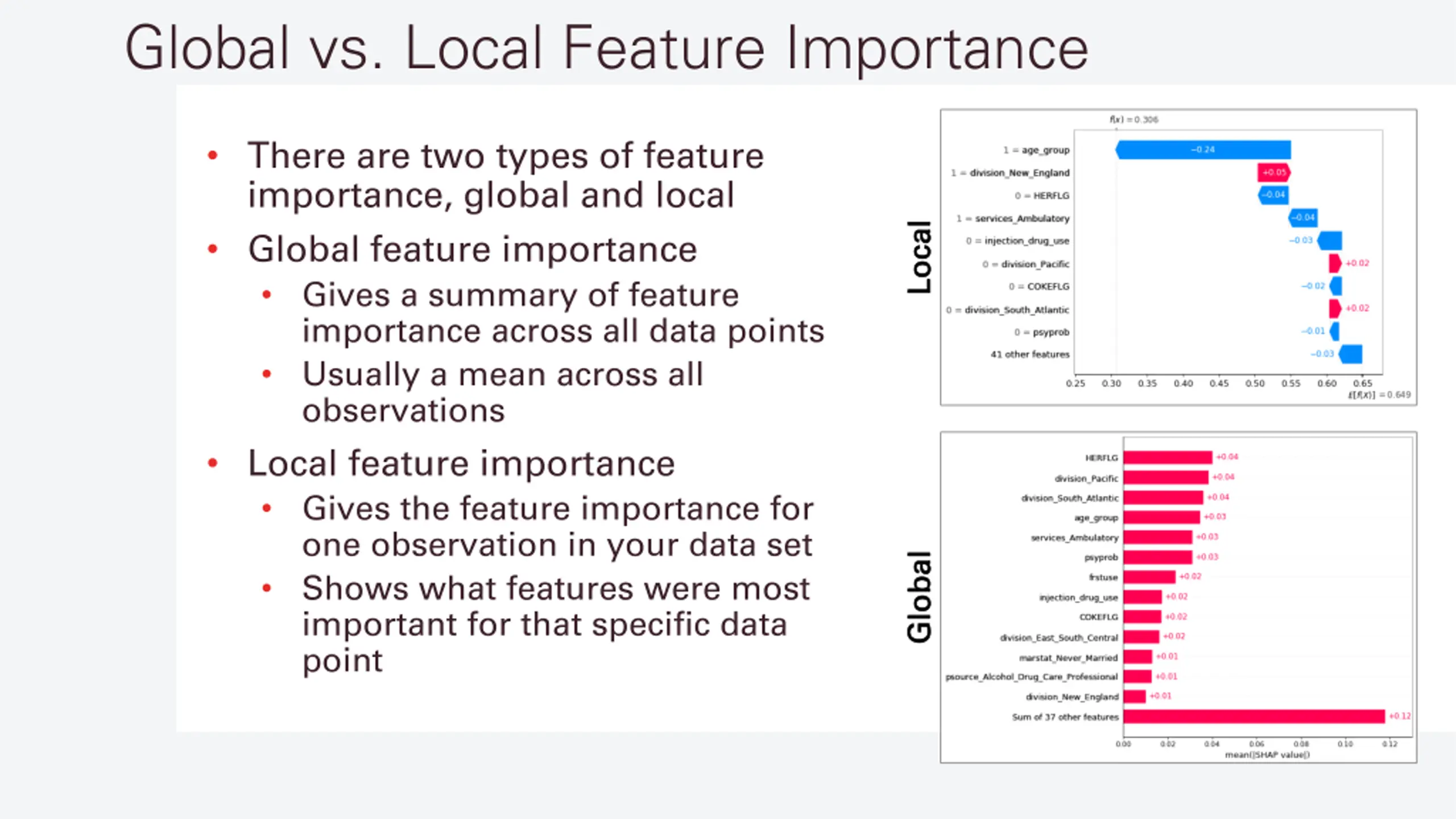 Global vs. Local Feature Importance There are two types of feature importance, global and local Global feature importance Gives a summary of feature importance across all data points Usually a mean across all observations Local feature importance Gives the feature importance for one observation in your data set Shows what features were most important for that specific data point Local Local Global Global
