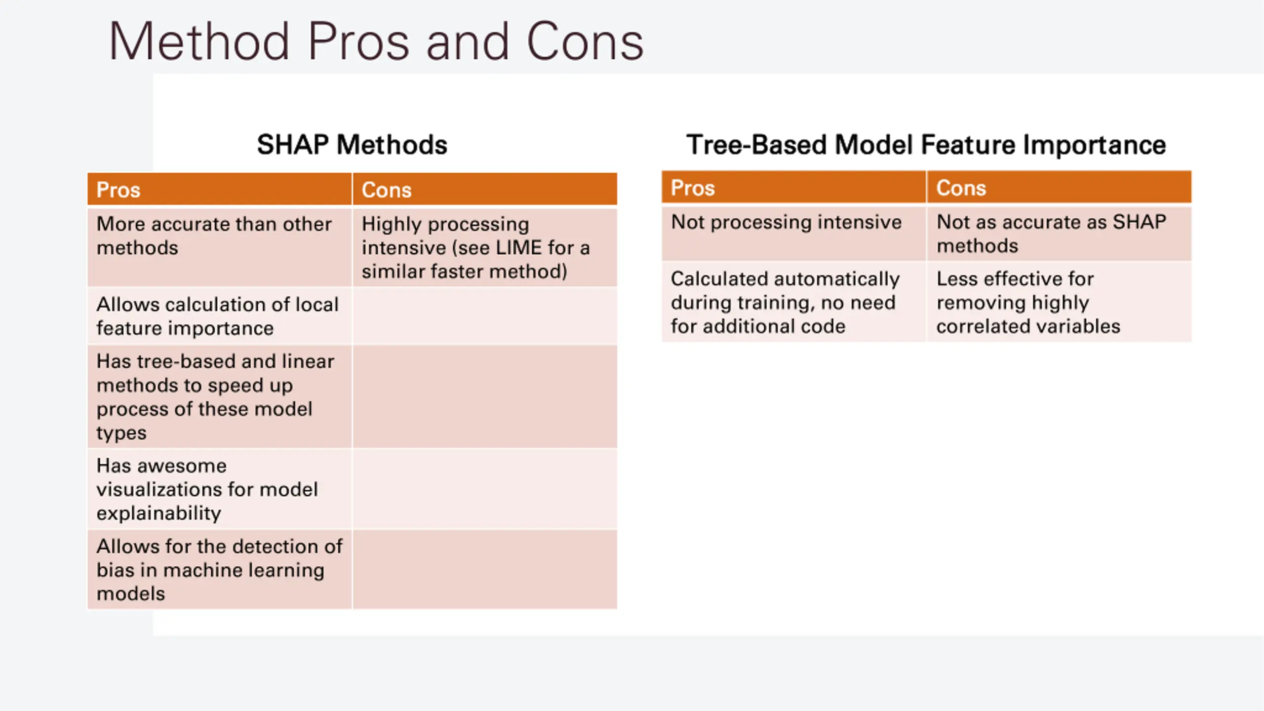 Method Pros and Cons SHAP Methods SHAP Methods Tree Tree- -Based Model Feature Importance Based Model Feature Importance Pros Pros Not processing intensive Cons Cons Not as accurate as SHAP methods Less effective for removing highly correlated variables Pros Pros More accurate than other methods Cons Cons Highly processing intensive (see LIME for a similar faster method) Calculated automatically during training, no need for additional code Allows calculation of local feature importance Has tree-based and linear methods to speed up process of these model types Has awesome visualizations for model explainability Allows for the detection of bias in machine learning models