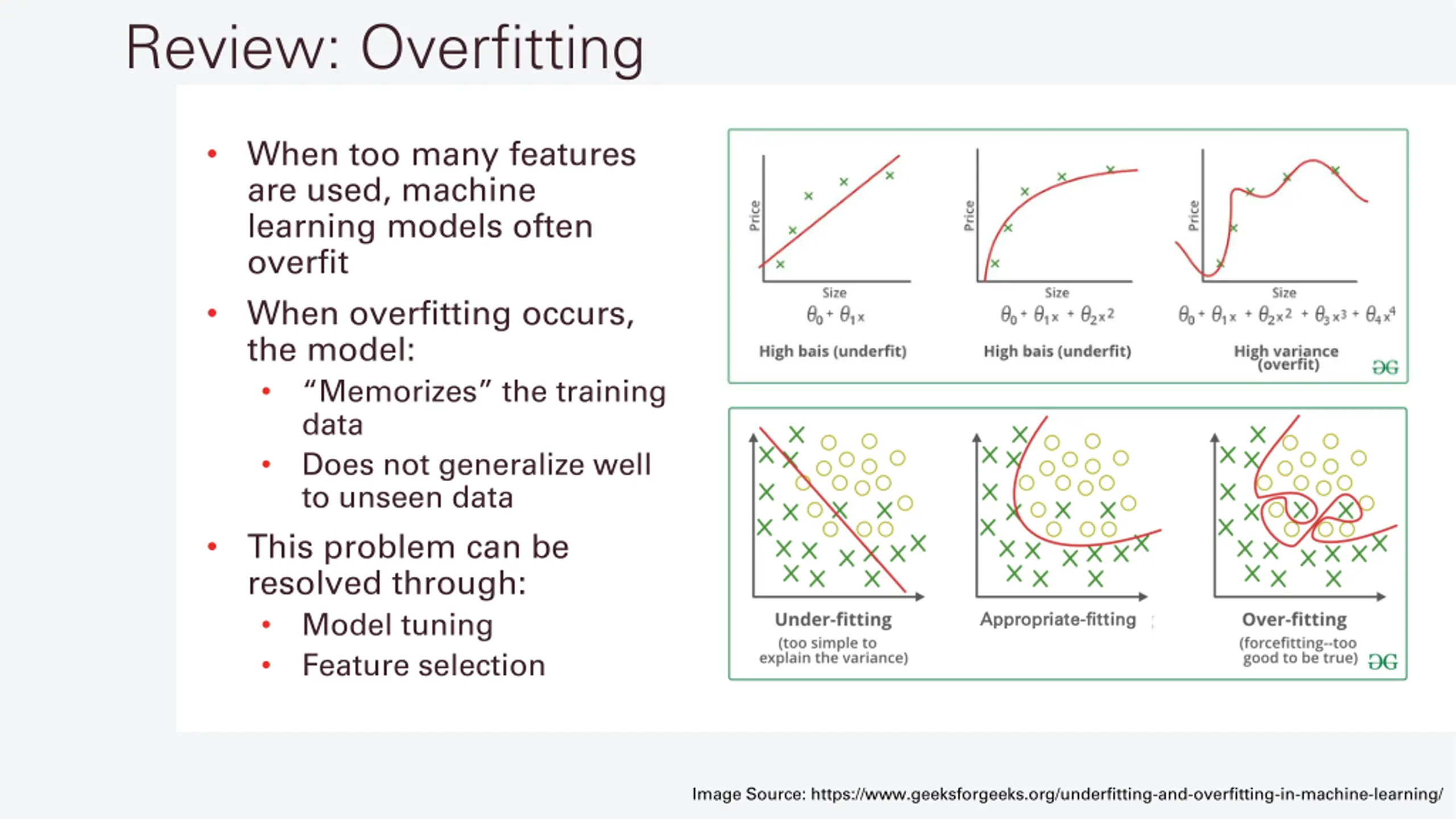 Review: Overfitting When too many features are used, machine learning models often overfit When overfitting occurs, the model: Memorizes the training data Does not generalize well to unseen data This problem can be resolved through: Model tuning Feature selection Appropriate Appropriate- -fitting fitting Image Source: https://www.geeksforgeeks.org/underfitting-and-overfitting-in-machine-learning/