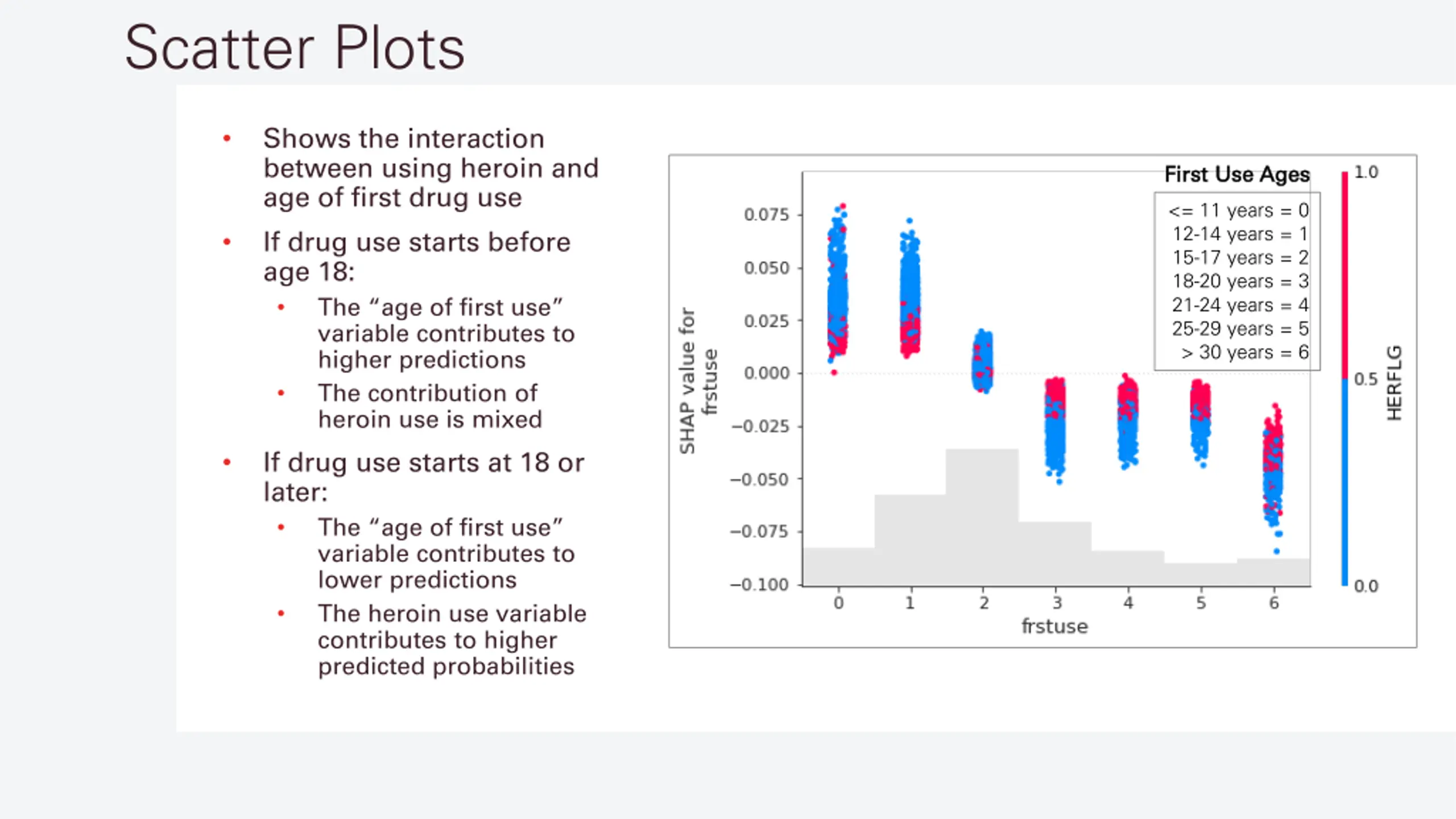 Scatter Plots Shows the interaction between using heroin and age of first drug use If drug use starts before age 18: The age of first use variable contributes to higher predictions The contribution of heroin use is mixed If drug use starts at 18 or later: The age of first use variable contributes to lower predictions The heroin use variable contributes to higher predicted probabilities First Use Ages First Use Ages <= 11 years = 0 12-14 years = 1 15-17 years = 2 18-20 years = 3 21-24 years = 4 25-29 years = 5 > 30 years = 6