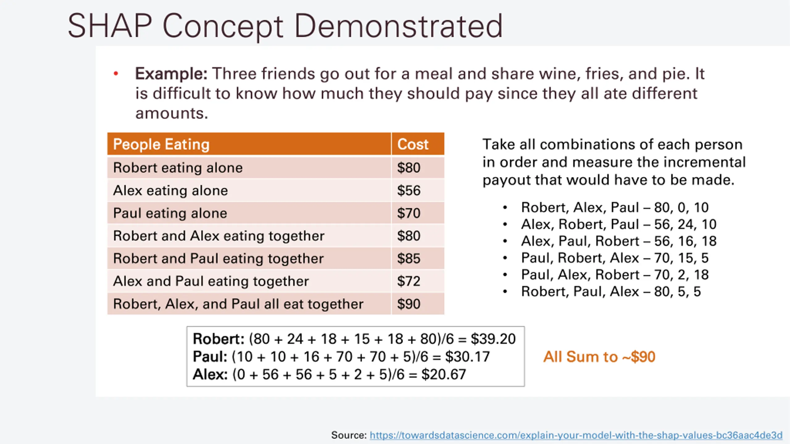SHAP Concept Demonstrated Example: Example: Three friends go out for a meal and share wine, fries, and pie. It is difficult to know how much they should pay since they all ate different amounts. People Eating People Eating Robert eating alone Alex eating alone Paul eating alone Robert and Alex eating together Robert and Paul eating together Alex and Paul eating together Robert, Alex, and Paul all eat together Cost Cost $80 $56 $70 $80 $85 $72 $90 Take all combinations of each person in order and measure the incremental payout that would have to be made. Robert, Alex, Paul 80, 0, 10 Alex, Robert, Paul 56, 24, 10 Alex, Paul, Robert 56, 16, 18 Paul, Robert, Alex 70, 15, 5 Paul, Alex, Robert 70, 2, 18 Robert, Paul, Alex 80, 5, 5 Robert: Robert: (80 + 24 + 18 + 15 + 18 + 80)/6 = $39.20 Paul: Paul: (10 + 10 + 16 + 70 + 70 + 5)/6 = $30.17 Alex: Alex: (0 + 56 + 56 + 5 + 2 + 5)/6 = $20.67 All Sum to ~$90 All Sum to ~$90 Source: https://towardsdatascience.com/explain-your-model-with-the-shap-values-bc36aac4de3d