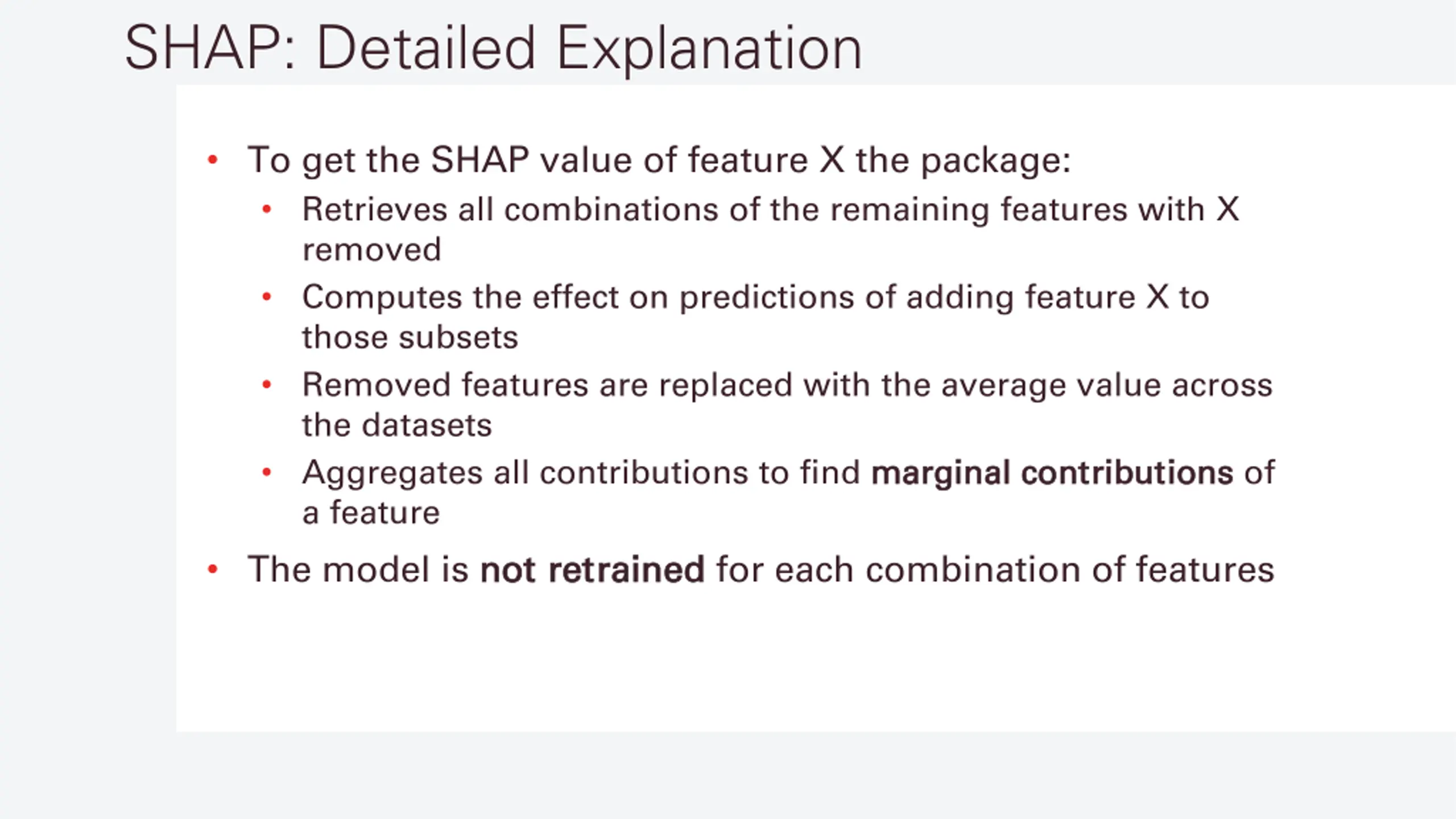 SHAP: Detailed Explanation To get the SHAP value of feature X the package: Retrieves all combinations of the remaining features with X removed Computes the effect on predictions of adding feature X to those subsets Removed features are replaced with the average value across the datasets Aggregates all contributions to find marginal contributions a feature The model is not retrained not retrained for each combination of features marginal contributions of