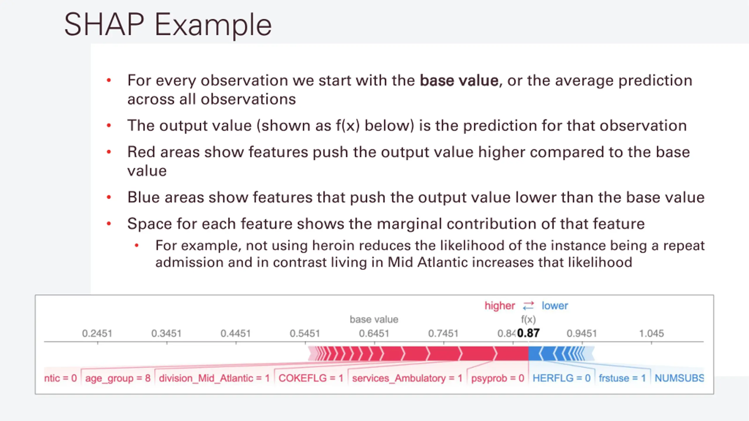 SHAP Example For every observation we start with the base value across all observations The output value (shown as f(x) below) is the prediction for that observation Red areas show features push the output value higher compared to the base value Blue areas show features that push the output value lower than the base value Space for each feature shows the marginal contribution of that feature For example, not using heroin reduces the likelihood of the instance being a repeat admission and in contrast living in Mid Atlantic increases that likelihood base value, or the average prediction