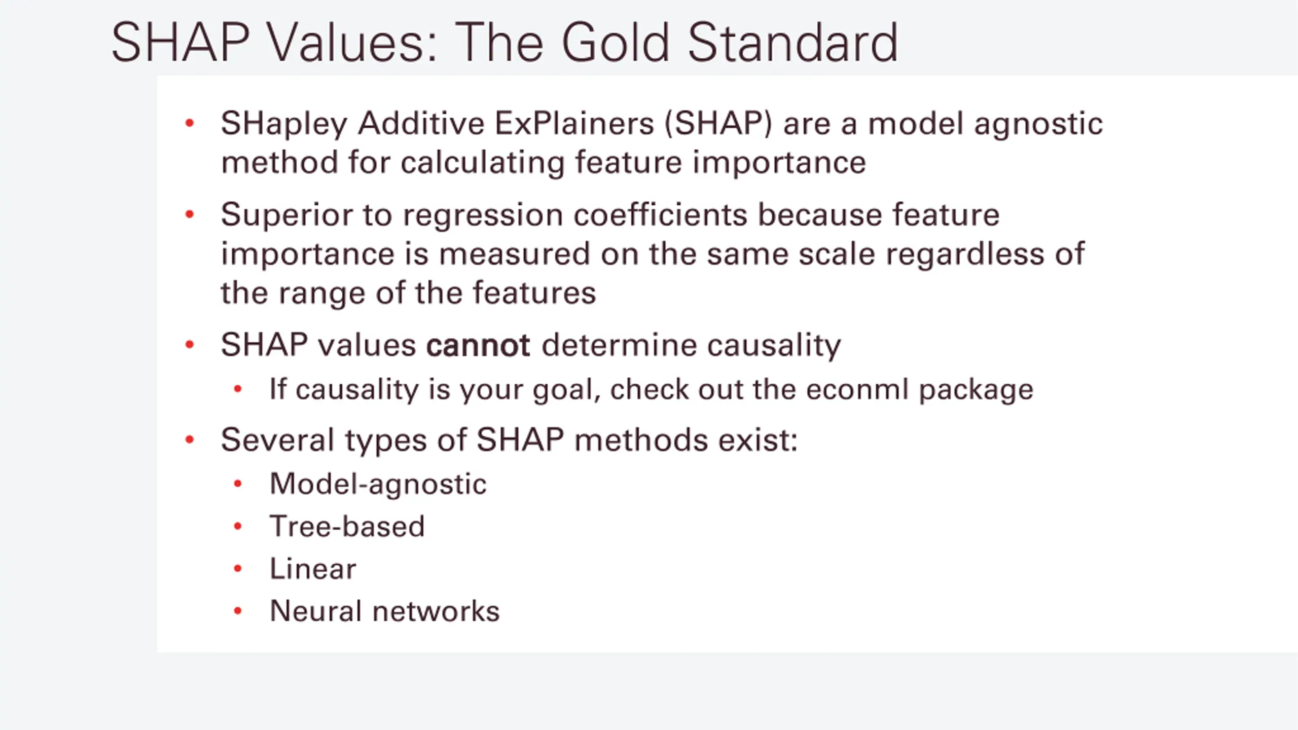 SHAP Values: The Gold Standard SHapley Additive ExPlainers (SHAP) are a model agnostic method for calculating feature importance Superior to regression coefficients because feature importance is measured on the same scale regardless of the range of the features SHAP values cannot cannot determine causality If causality is your goal, check out the econml package Several types of SHAP methods exist: Model-agnostic Tree-based Linear Neural networks