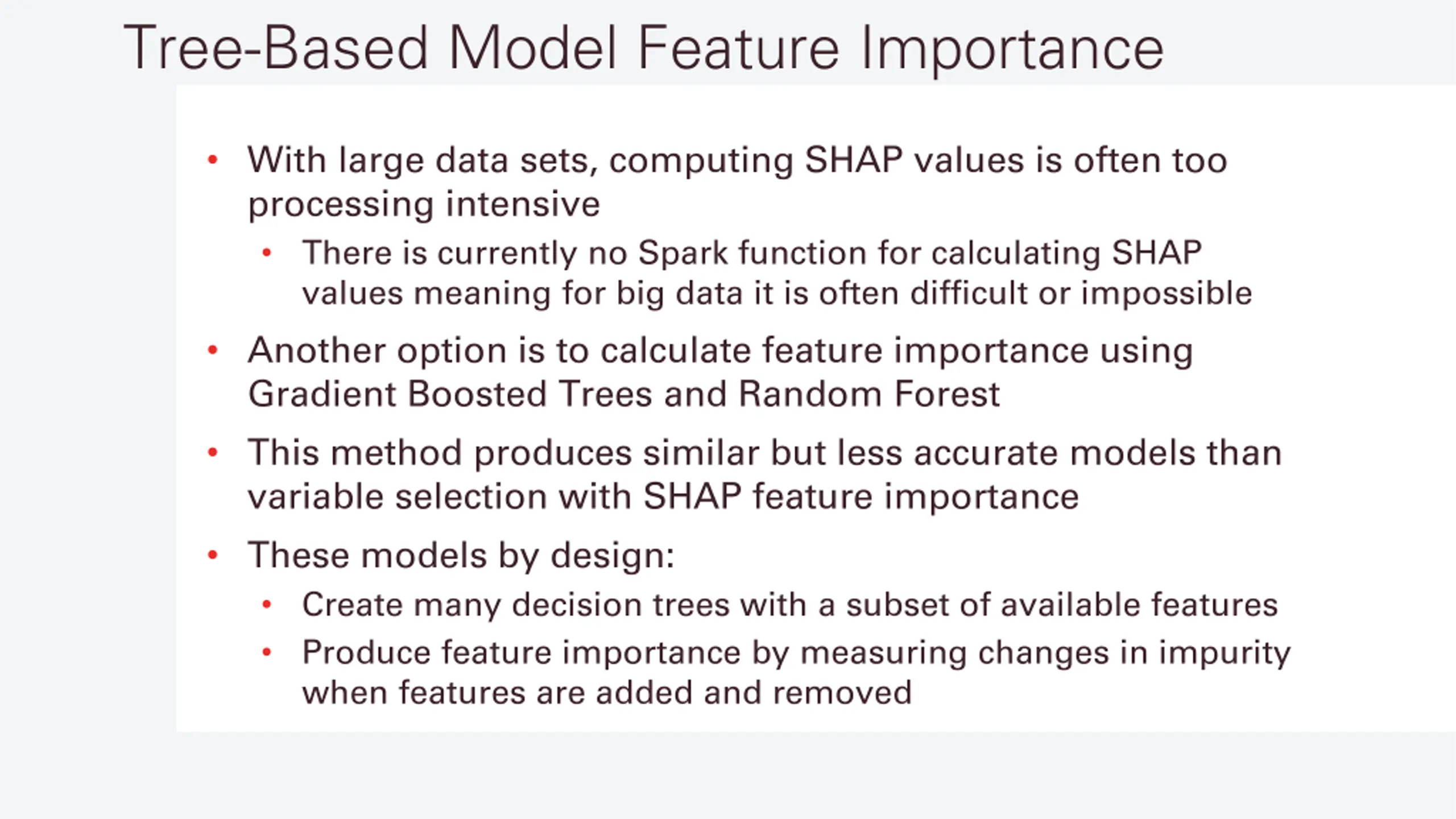 Tree-Based Model Feature Importance With large data sets, computing SHAP values is often too processing intensive There is currently no Spark function for calculating SHAP values meaning for big data it is often difficult or impossible Another option is to calculate feature importance using Gradient Boosted Trees and Random Forest This method produces similar but less accurate models than variable selection with SHAP feature importance These models by design: Create many decision trees with a subset of available features Produce feature importance by measuring changes in impurity when features are added and removed