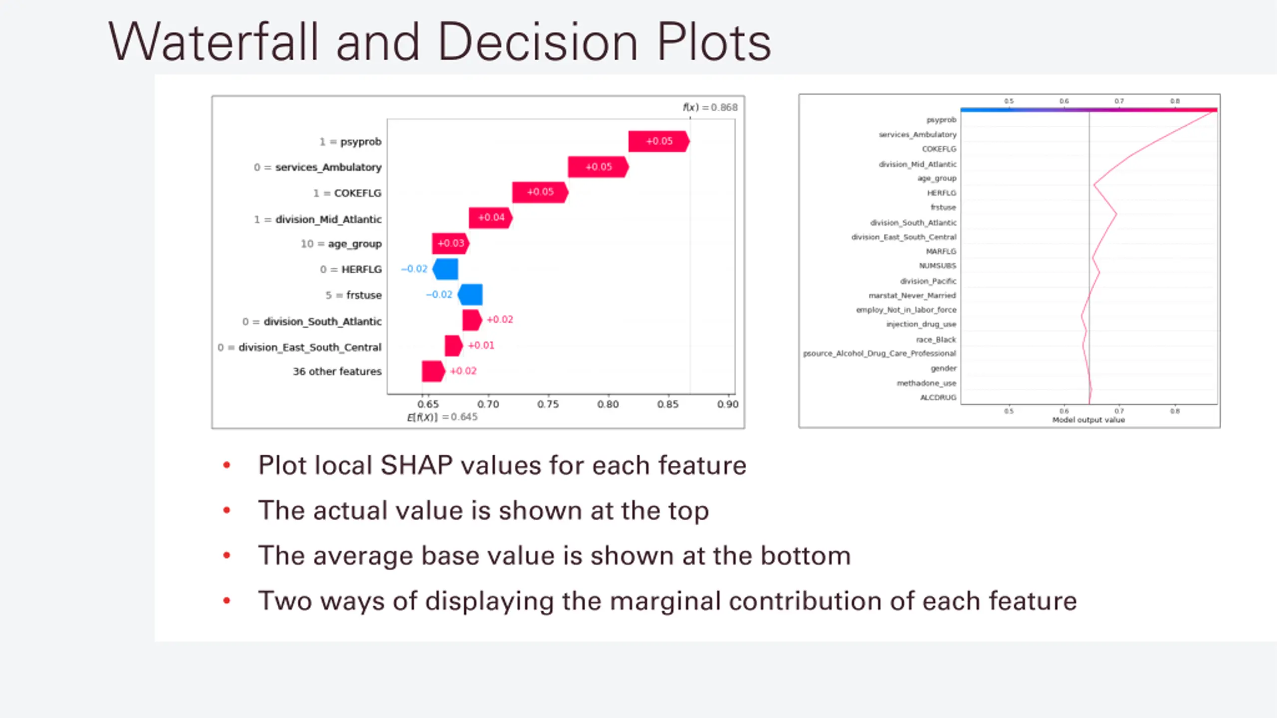 Waterfall and Decision Plots Plot local SHAP values for each feature The actual value is shown at the top The average base value is shown at the bottom Two ways of displaying the marginal contribution of each feature