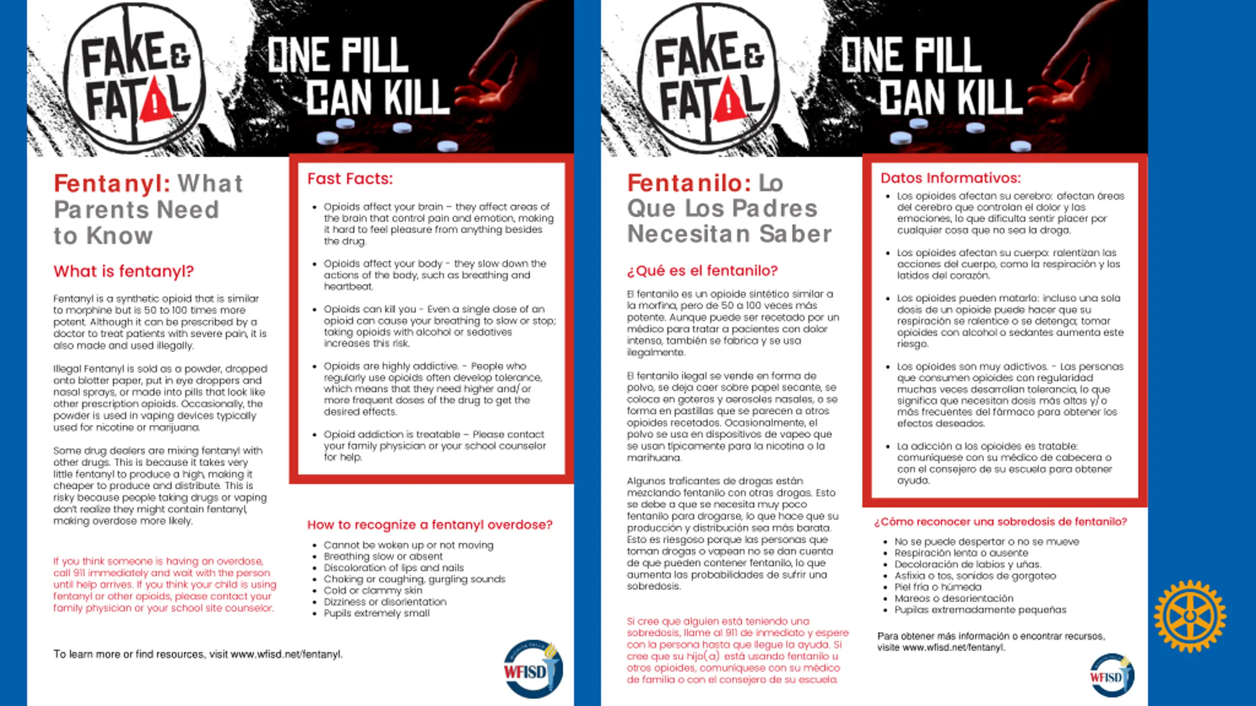 Club of Southwest Wichita Falls Datos Informativos: Fast Facts: Fentanilo: Lo Que Los Padres Necesitan Saber Fentanyl: What Parents Need to Know Los opioides afectan su cerebro: afectan reas del cerebro que controlan el dolor y las emociones, lo que dificulta sentir placer por cualquier cosa que no sea la droga. Opioids affect your brain they affect areas of the brain that control pain and emotion, making it hard to feel pleasure from anything besides the drug. Los opioides afectan su cuerpo: ralentizan las acciones del cuerpo, como la respiraci n y los latidos del coraz n. Opioids affect your body - they slow down the actions of the body, such as breathing and heartbeat. What is fentanyl? Qu es el fentanilo? El fentanilo es un opioide sint tico similar a la morfina, pero de 50 a 100 veces m s potente. Aunque puede ser recetado por un m dico para tratar a pacientes con dolor intenso, tambi n se fabrica y se usa ilegalmente. Los opioides pueden matarlo: incluso una sola dosis de un opioide puede hacer que su respiraci n se ralentice o se detenga; tomar opioides con alcohol o sedantes aumenta este riesgo. Fentanyl is a synthetic opioid that is similar to morphine but is 50 to 100 times more potent. Although it can be prescribed by a doctor to treat patients with severe pain, it is also made and used illegally. Opioids can kill you - Even a single dose of an opioid can cause your breathing to slow or stop; taking opioids with alcohol or sedatives increases this risk. Opioids are highly addictive. - People who regularly use opioids often develop tolerance, which means that they need higher and/or more frequent doses of the drug to get the desired effects. Los opioides son muy adictivos. - Las personas que consumen opioides con regularidad muchas veces desarrollan tolerancia, lo que significa que necesitan dosis m s altas y/o m s frecuentes del f rmaco para obtener los efectos deseados. Illegal Fentanyl is sold as a powder, dropped onto blotter paper, put in eye droppers and nasal sprays, or made into pills that look like other prescription opioids. Occasionally, the powder is used in vaping devices typically used for nicotine or marijuana. El fentanilo ilegal se vende en forma de polvo, se deja caer sobre papel secante, se coloca en goteros y aerosoles nasales, o se forma en pastillas que se parecen a otros opioides recetados. Ocasionalmente, el polvo se usa en dispositivos de vapeo que se usan t picamente para la nicotina o la marihuana. Opioid addiction is treatable Please contact your family physician or your school counselor for help. La adicci n a los opioides es tratable: comun quese con su m dico de cabecera o con el consejero de su escuela para obtener ayuda. Some drug dealers are mixing fentanyl with other drugs. This is because it takes very little fentanyl to produce a high, making it cheaper to produce and distribute. This is risky because people taking drugs or vaping don t realize they might contain fentanyl, making overdose more likely. Algunos traficantes de drogas est n mezclando fentanilo con otras drogas. Esto se debe a que se necesita muy poco fentanilo para drogarse, lo que hace que su producci n y distribuci n sea m s barata. Esto es riesgoso porque las personas que toman drogas o vapean no se dan cuenta de que pueden contener fentanilo, lo que aumenta las probabilidades de sufrir una sobredosis. C mo reconocer una sobredosis de fentanilo? How to recognize a fentanyl overdose? No se puede despertar o no se mueve Respiraci n lenta o ausente Decoloraci n de labios y u as. Asfixia o tos, sonidos de gorgoteo Piel fr a o h meda Mareos o desorientaci n Pupilas extremadamente peque as Cannot be woken up or not moving Breathing slow or absent Discoloration of lips and nails Choking or coughing, gurgling sounds Cold or clammy skin Dizziness or disorientation Pupils extremely small If you think someone is having an overdose, call 911 immediately and wait with the person until help arrives. If you think your child is using fentanyl or other opioids, please contact your family physician or your school site counselor. Si cree que alguien est teniendo una sobredosis, llame al 911 de inmediato y espere con la persona hasta que llegue la ayuda. Si cree que su hijo(a) est usando fentanilo u otros opioides, comun quese con su m dico ara o tener m s informaci n o encontrar recursos, visite www.wfisd.net/fentanyl. Club of Southwest Wichita Falls de familia o con el consejero de su escuela. To learn more or find resources, visit www.wfisd.net/fentanyl.