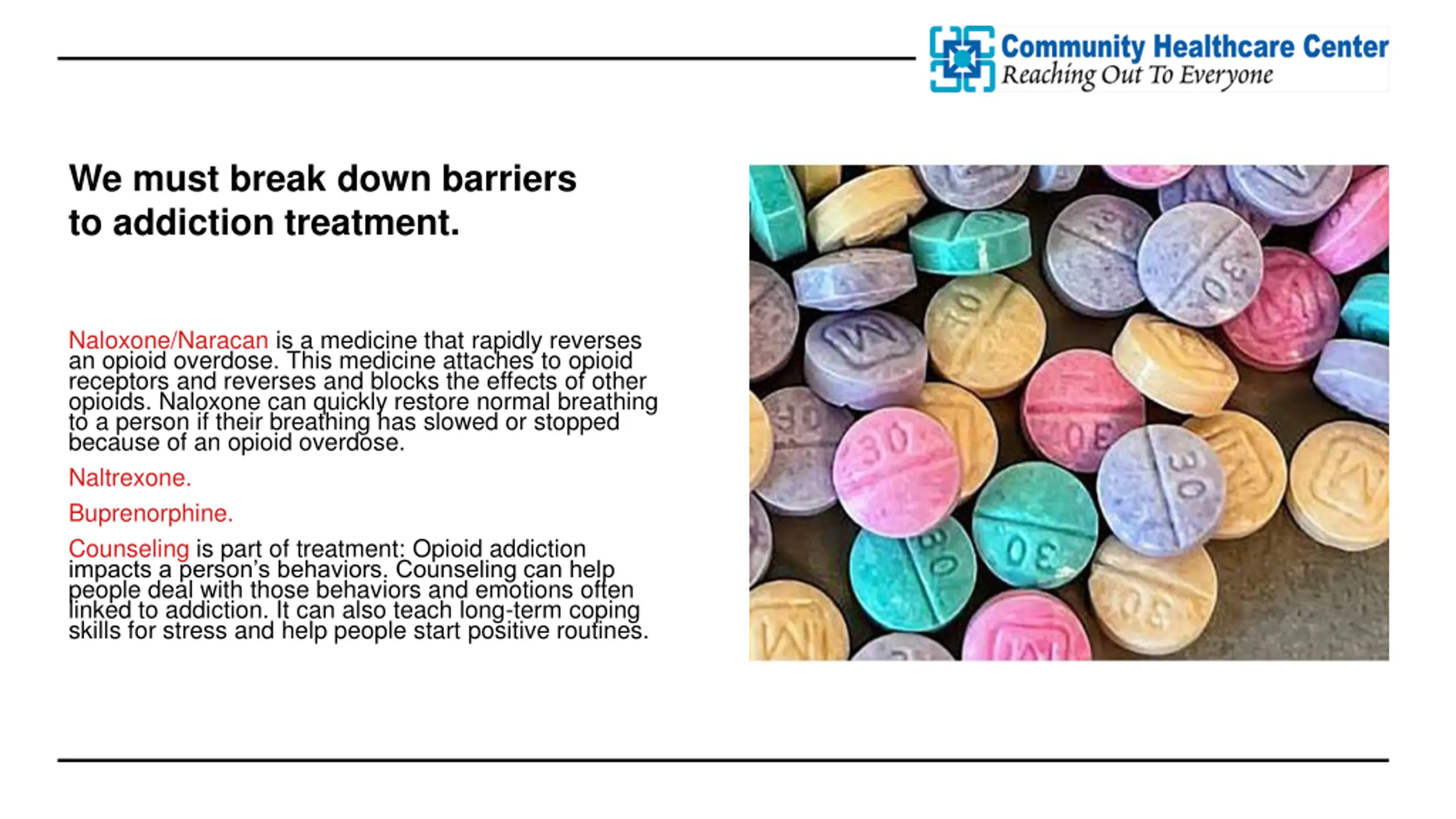 We must break down barriers to addiction treatment. Naloxone/Naracan is a medicine that rapidly reverses an opioid overdose. This medicine attaches to opioid receptors and reverses and blocks the effects of other opioids. Naloxone can quickly restore normal breathing to a person if their breathing has slowed or stopped because of an opioid overdose. Naltrexone. Buprenorphine. Counseling is part of treatment: Opioid addiction impacts a person s behaviors. Counseling can help people deal with those behaviors and emotions often linked to addiction. It can also teach long-term coping skills for stress and help people start positive routines.