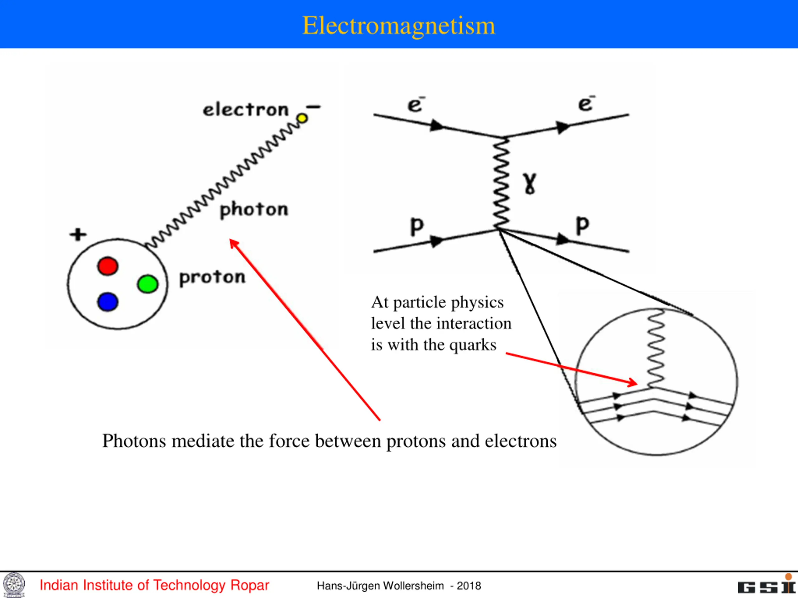 Electromagnetism At particle physics level the interaction is with the quarks Photons mediate the force between protons and electrons Indian Institute of Technology Ropar Hans-J rgen Wollersheim - 2018