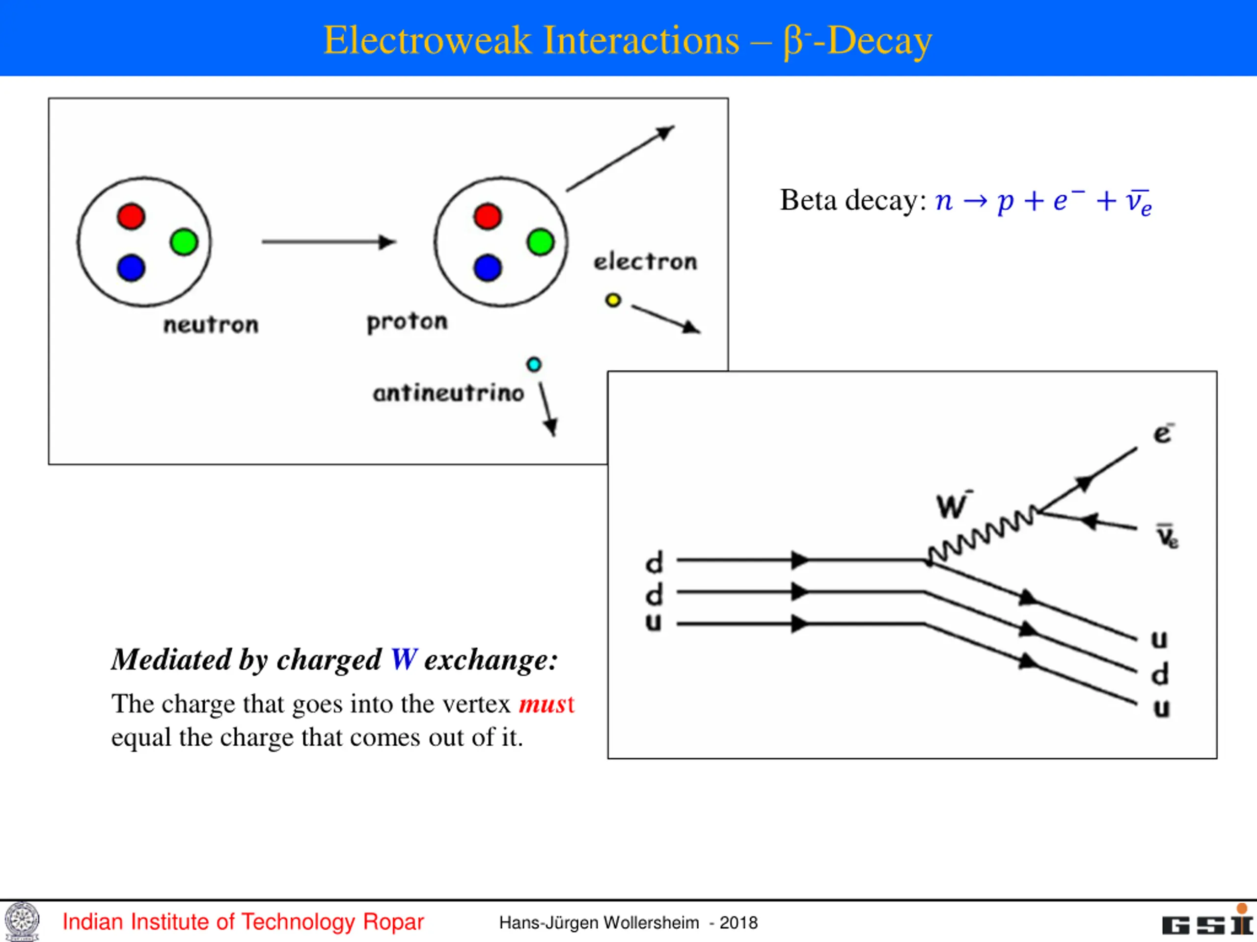 Electroweak Interactions --Decay Beta decay: ? ? + ? + ?? Mediated by charged W exchange: The charge that goes into the vertex must equal the charge that comes out of it. Indian Institute of Technology Ropar Hans-J rgen Wollersheim - 2018