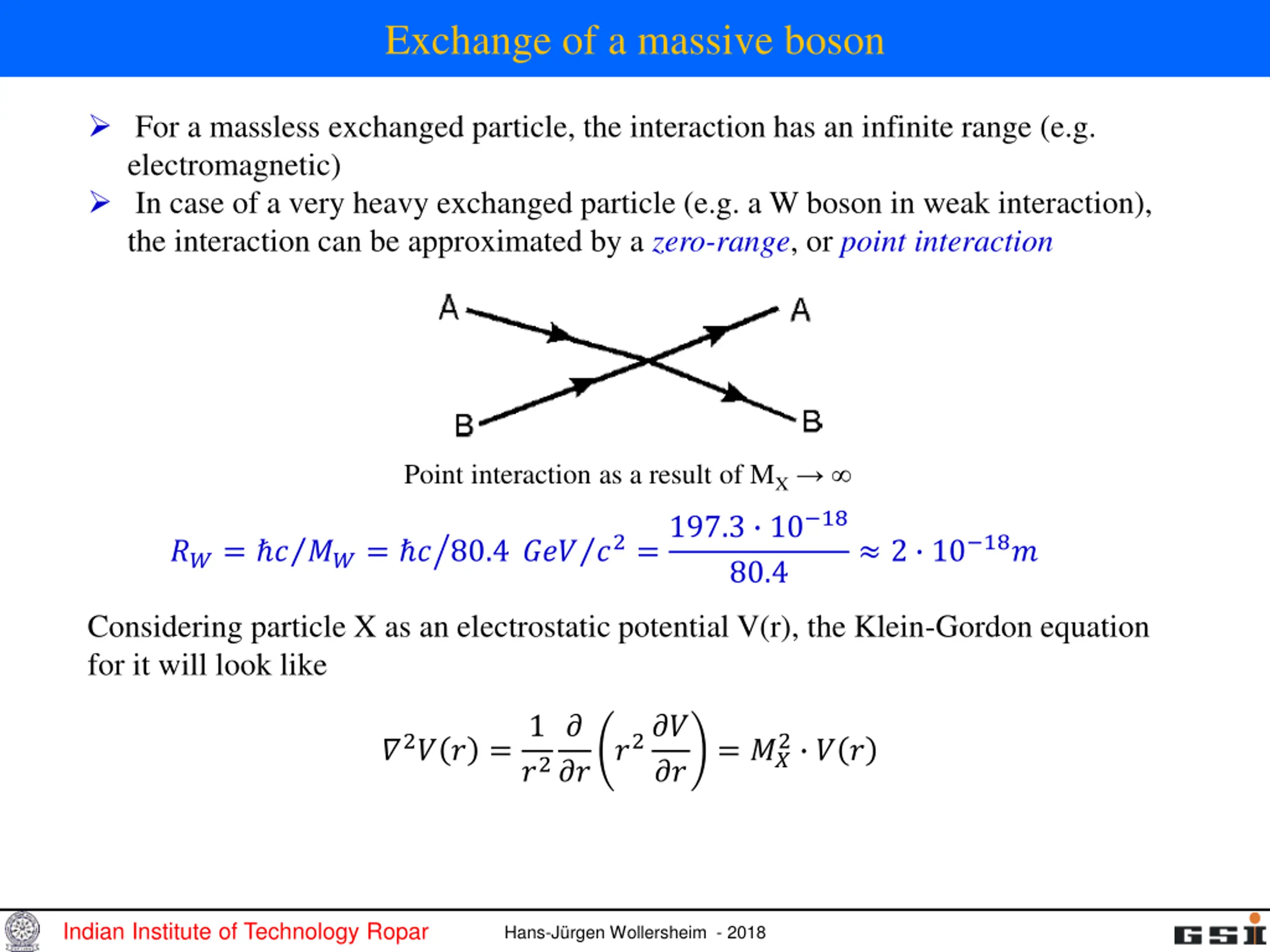Exchange of a massive boson For a massless exchanged particle, the interaction has an infinite range (e.g. electromagnetic) In case of a very heavy exchanged particle (e.g. a W boson in weak interaction), the interaction can be approximated by a zero-range, or point interaction Point interaction as a result of MX ??? ?2=197.3 10 18 2 10 18? ??= ? ??= ? 80.4 80.4 Considering particle X as an electrostatic potential V(r), the Klein-Gordon equation for it will look like 1 ?2 ? ?? ?2?? 2 ? ? ?2? ? = = ?? ?? Indian Institute of Technology Ropar Hans-J rgen Wollersheim - 2018