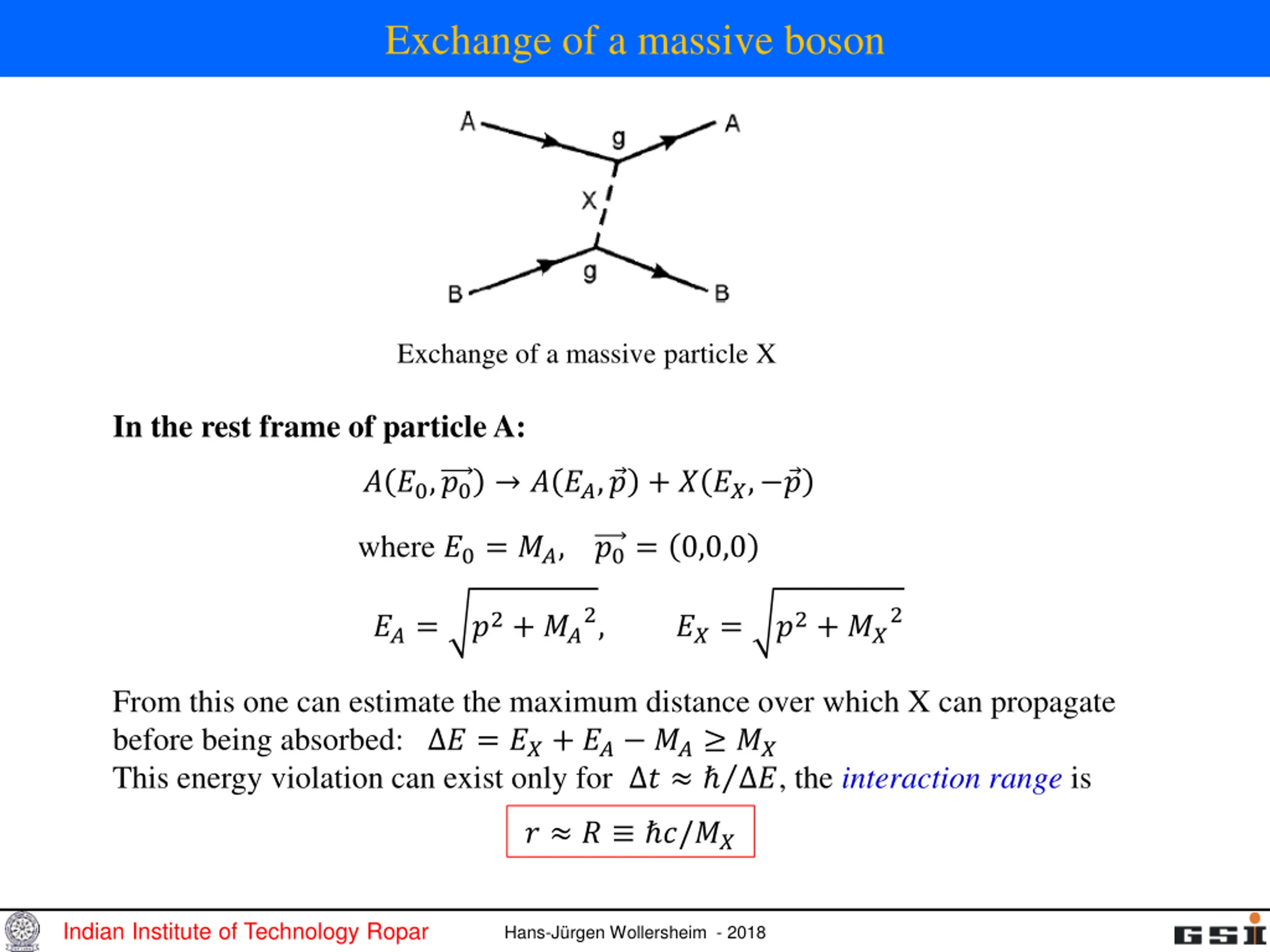Exchange of a massive boson Exchange of a massive particle X In the rest frame of particle A: ? ?0,?0 ? ??, ? + ? ??, ? where ?0= ??, ?0= 0,0,0 ?2+ ??2, ?2+ ??2 ??= ??= From this one can estimate the maximum distance over which X can propagate before being absorbed: ? = ??+ ?? ?? ?? This energy violation can exist only for ? ?, the interaction range is ? ? ?/?? Indian Institute of Technology Ropar Hans-J rgen Wollersheim - 2018