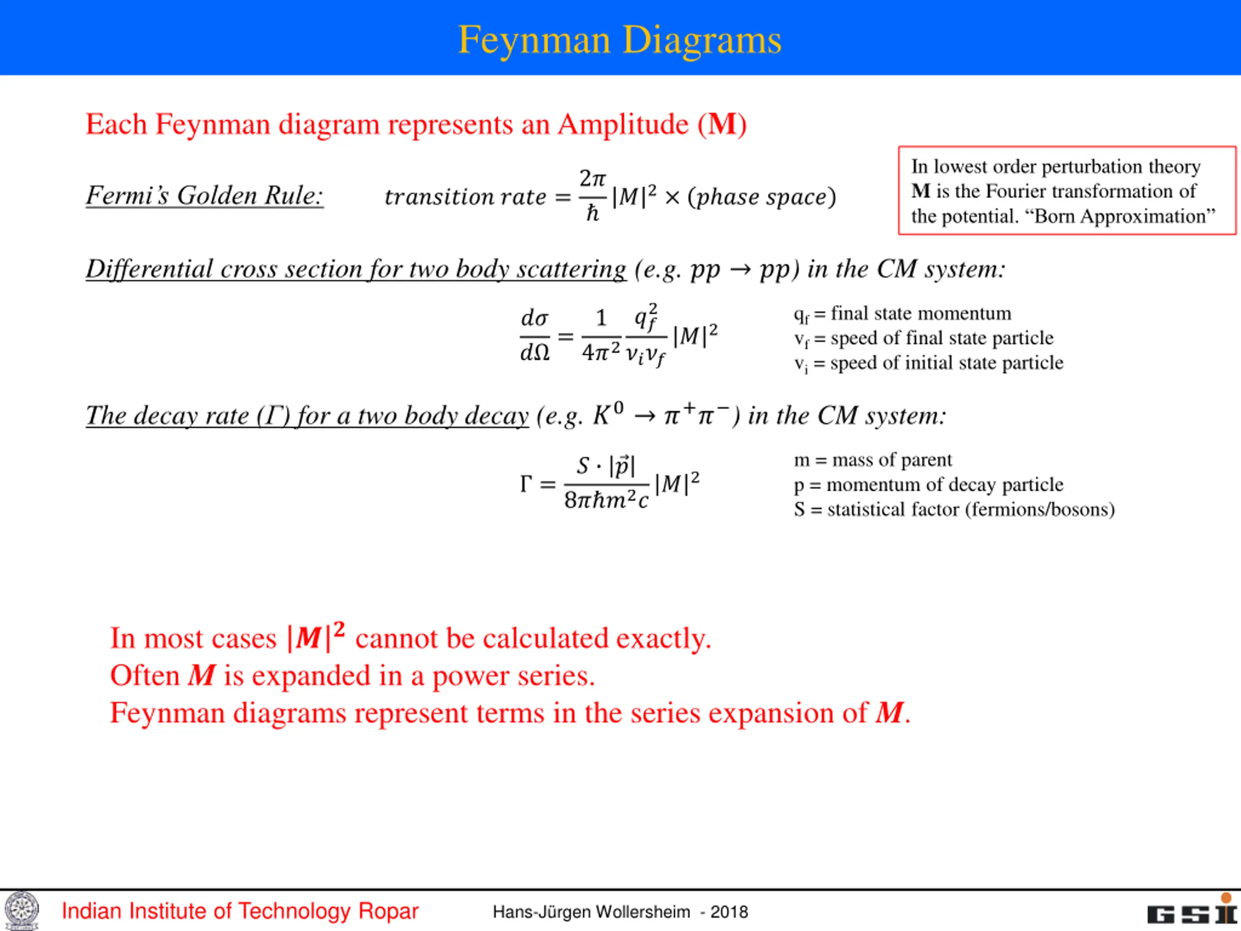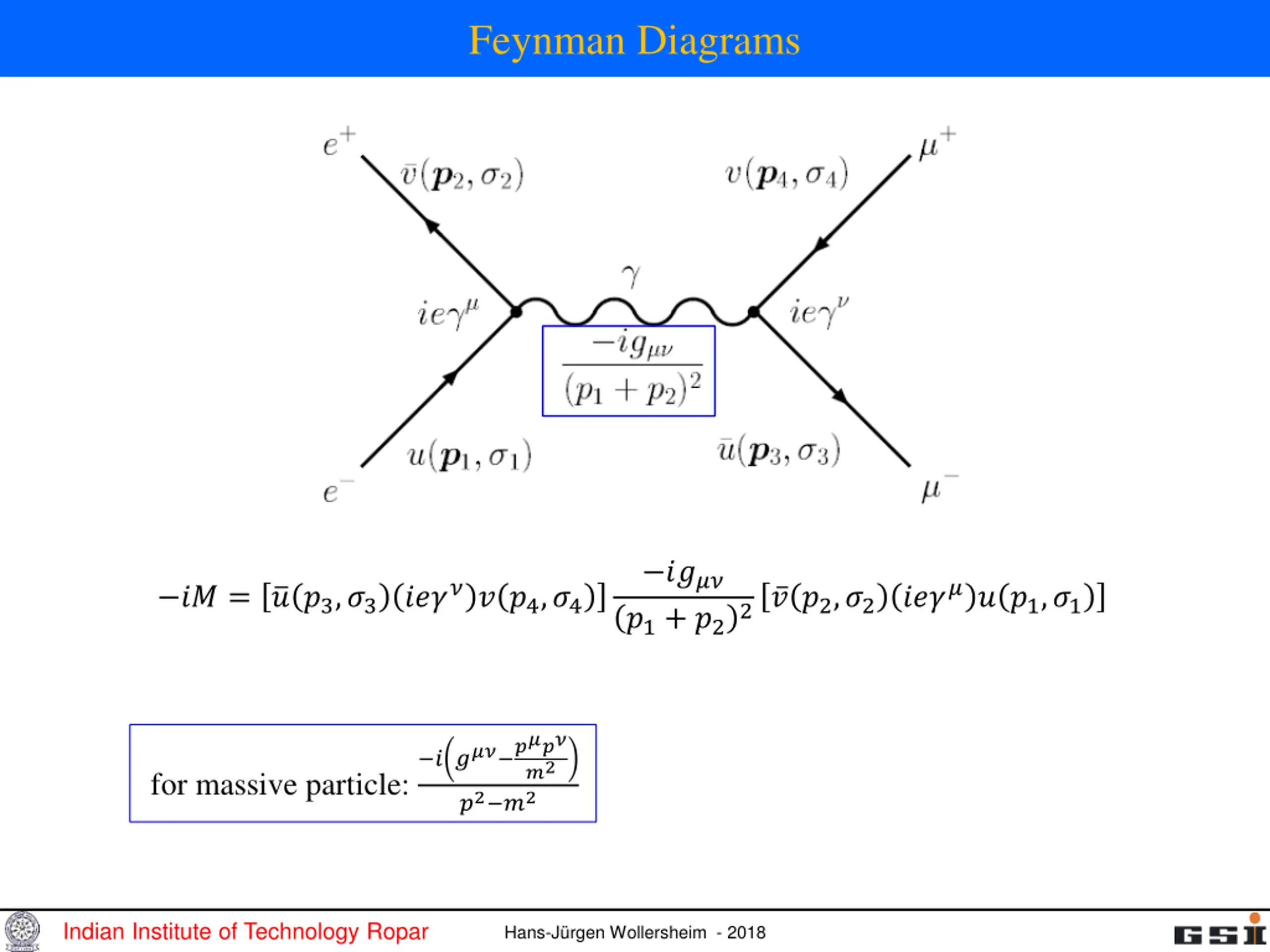 Feynman Diagrams ???? ?1+ ?2 ?? = ? ?3,?3 ????? ?4,?4 ? ?2,?2 ????? ?1,?1 2 ? ??? ???? ?2 for massive particle: ?2 ?2 Indian Institute of Technology Ropar Hans-J rgen Wollersheim - 2018