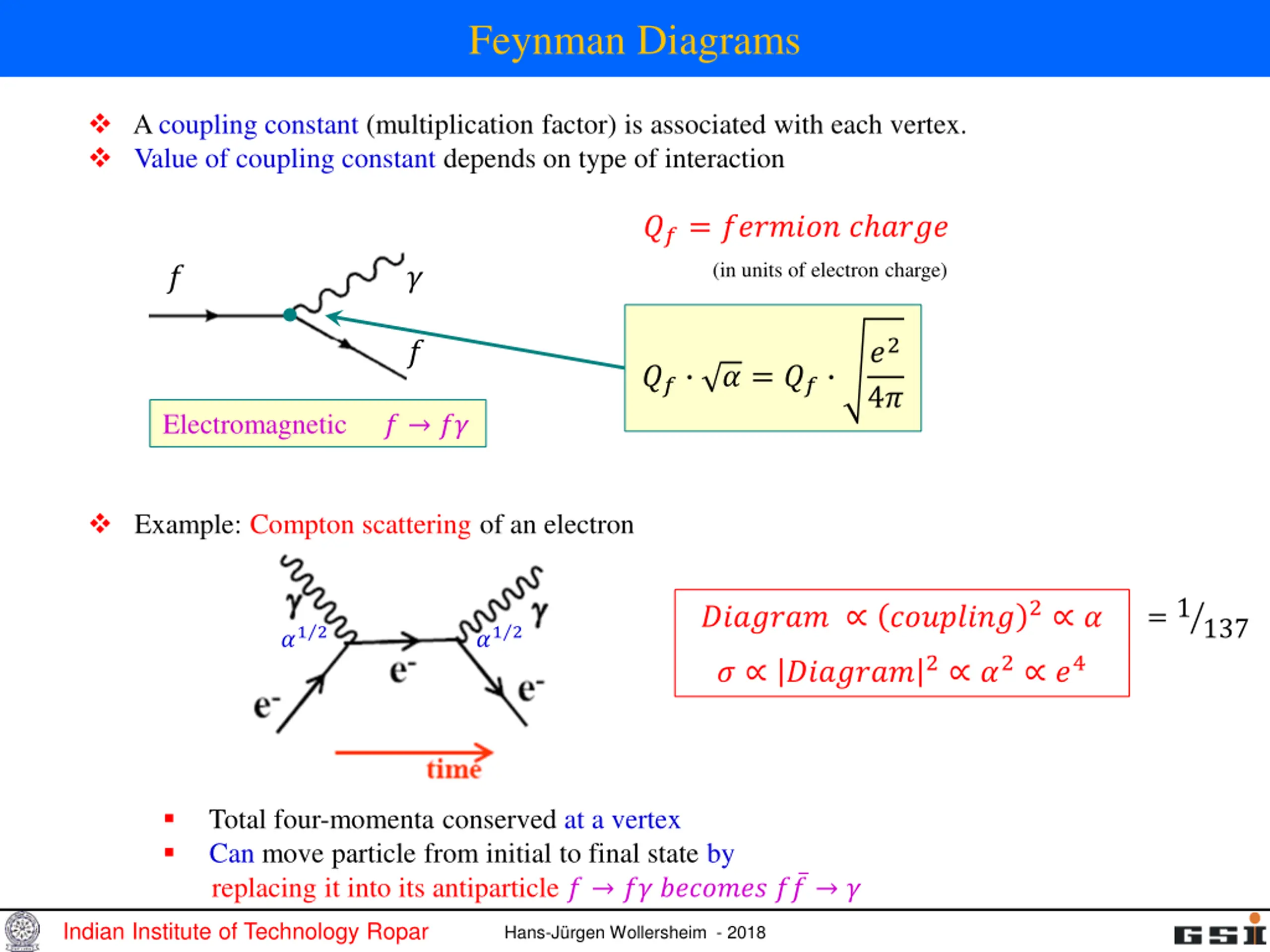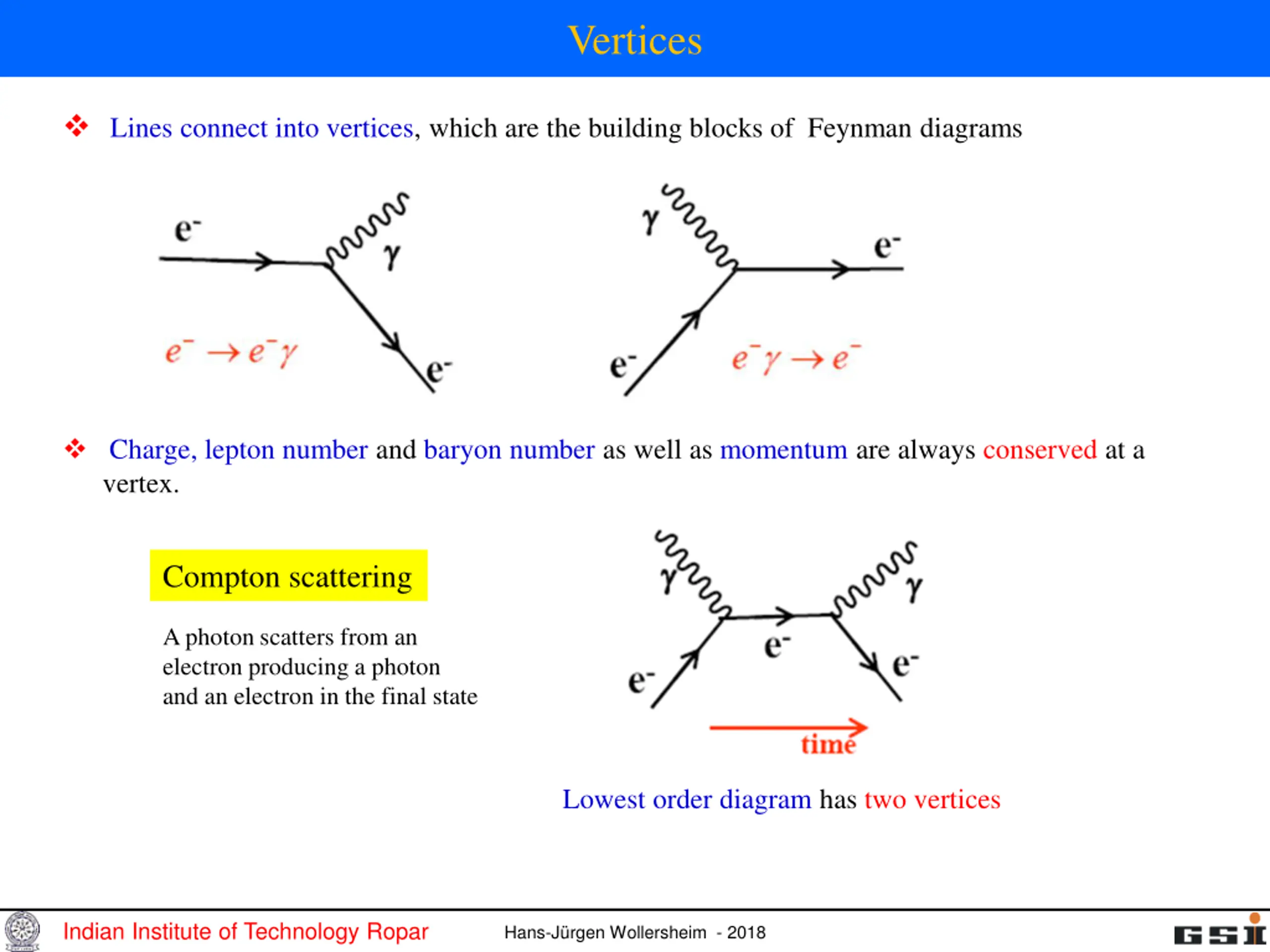 Vertices Lines connect into vertices, which are the building blocks of Feynman diagrams Charge, lepton number and baryon number as well as momentum are always conserved at a vertex. Compton scattering Aphoton scatters from an electron producing a photon and an electron in the final state Lowest order diagram has two vertices Indian Institute of Technology Ropar Hans-J rgen Wollersheim - 2018