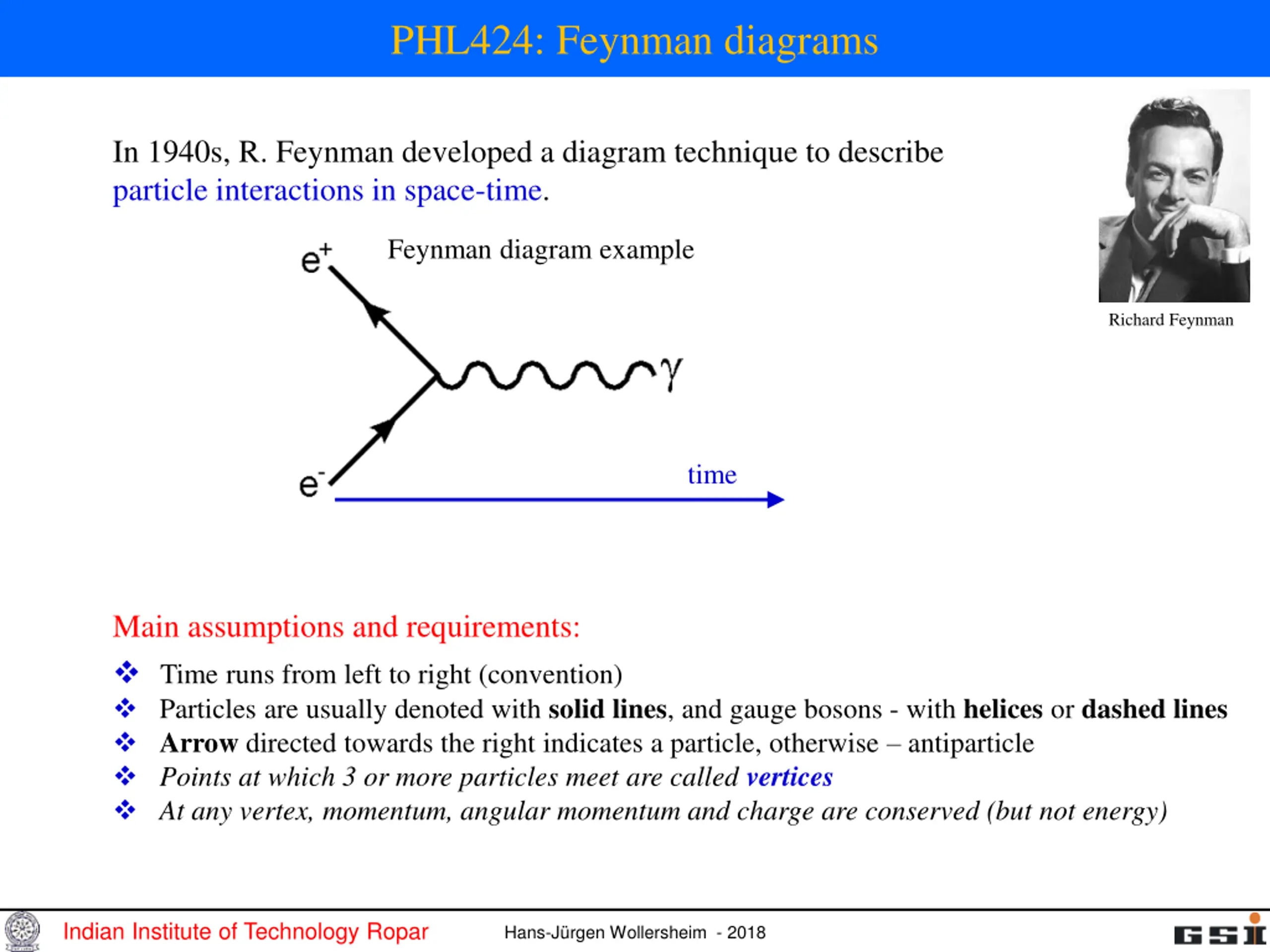 PHL424: Feynman diagrams In 1940s, R. Feynman developed a diagram technique to describe particle interactions in space-time. Feynman diagram example Richard Feynman time Main assumptions and requirements: Time runs from left to right (convention) Particles are usually denoted with solid lines, and gauge bosons - with helices or dashed lines Arrow directed towards the right indicates a particle, otherwise antiparticle Points at which 3 or more particles meet are called vertices At any vertex, momentum, angular momentum and charge are conserved (but not energy) Indian Institute of Technology Ropar Hans-J rgen Wollersheim - 2018