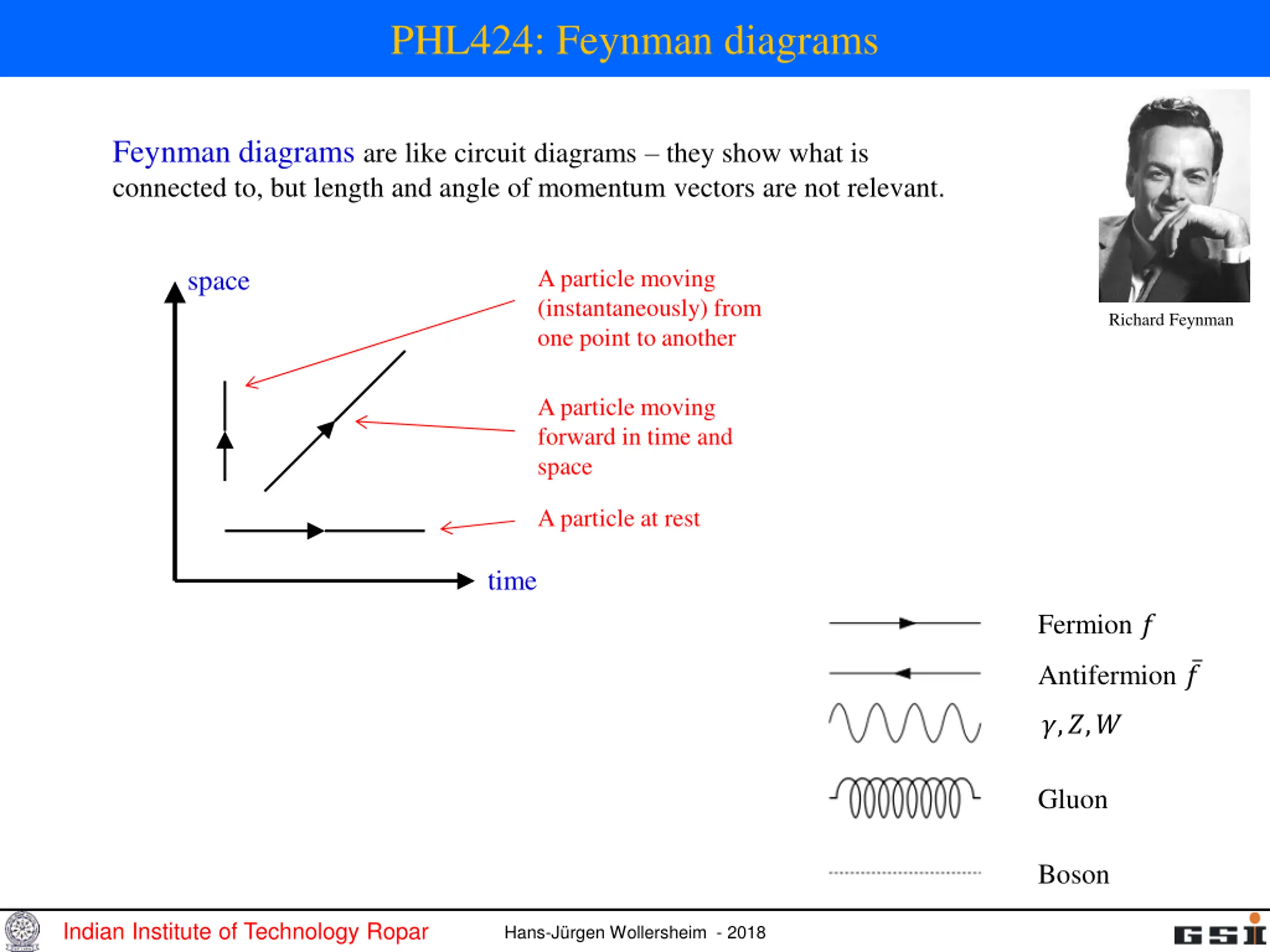 PHL424: Feynman diagrams Feynman diagrams are like circuit diagrams they show what is connected to, but length and angle of momentum vectors are not relevant. A particle moving (instantaneously) from one point to another space Richard Feynman A particle moving forward in time and space A particle at rest time Fermion ? Antifermion ? ?,?,? Gluon Boson Indian Institute of Technology Ropar Hans-J rgen Wollersheim - 2018