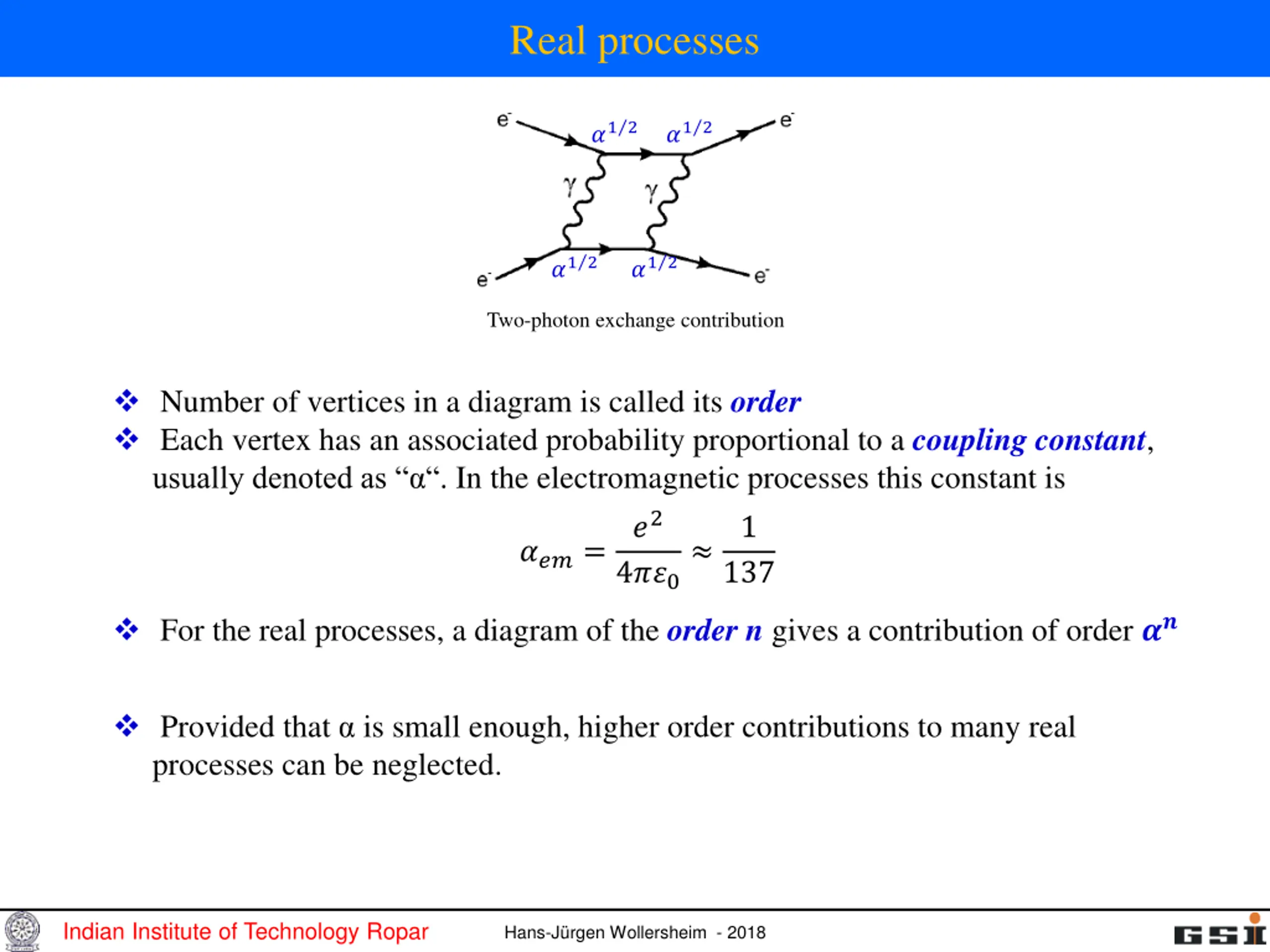 Real processes ? ? 1 2 1 2 ? ? 1 2 1 2 Two-photon exchange contribution Number of vertices in a diagram is called its order Each vertex has an associated probability proportional to a coupling constant, usually denoted as . In the electromagnetic processes this constant is ?2 4??0 1 ???= 137 For the real processes, a diagram of the order n gives a contribution of order ?? Provided that is small enough, higher order contributions to many real processes can be neglected. Indian Institute of Technology Ropar Hans-J rgen Wollersheim - 2018