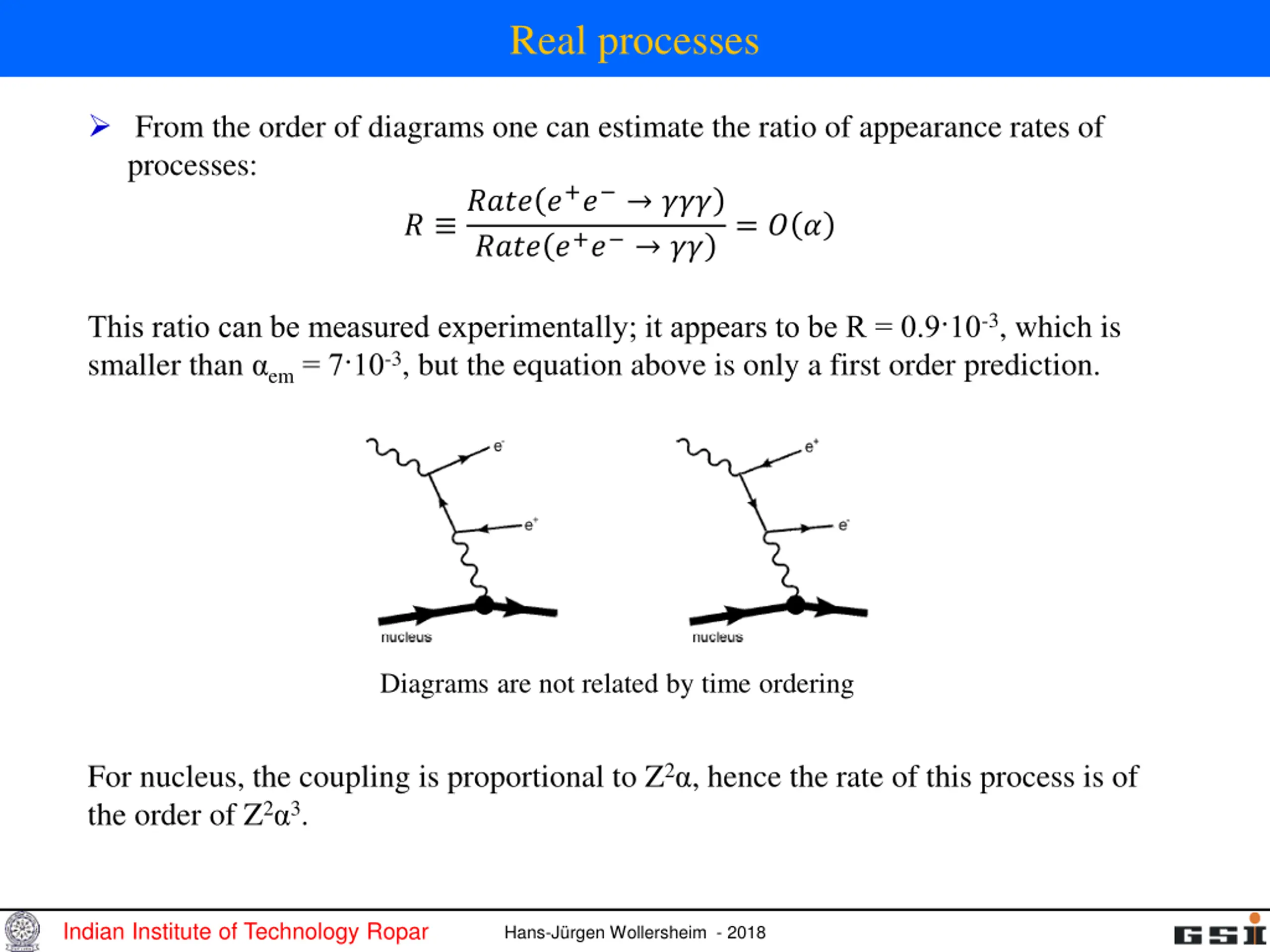 Real processes From the order of diagrams one can estimate the ratio of appearance rates of processes: ? ???? ?+? ??? ???? ?+? ?? = ? ? This ratio can be measured experimentally; it appears to be R = 0.9 10-3, which is smaller than em= 7 10-3, but the equation above is only a first order prediction. Diagrams are not related by time ordering For nucleus, the coupling is proportional to Z2 , hence the rate of this process is of the order of Z2 3. Indian Institute of Technology Ropar Hans-J rgen Wollersheim - 2018