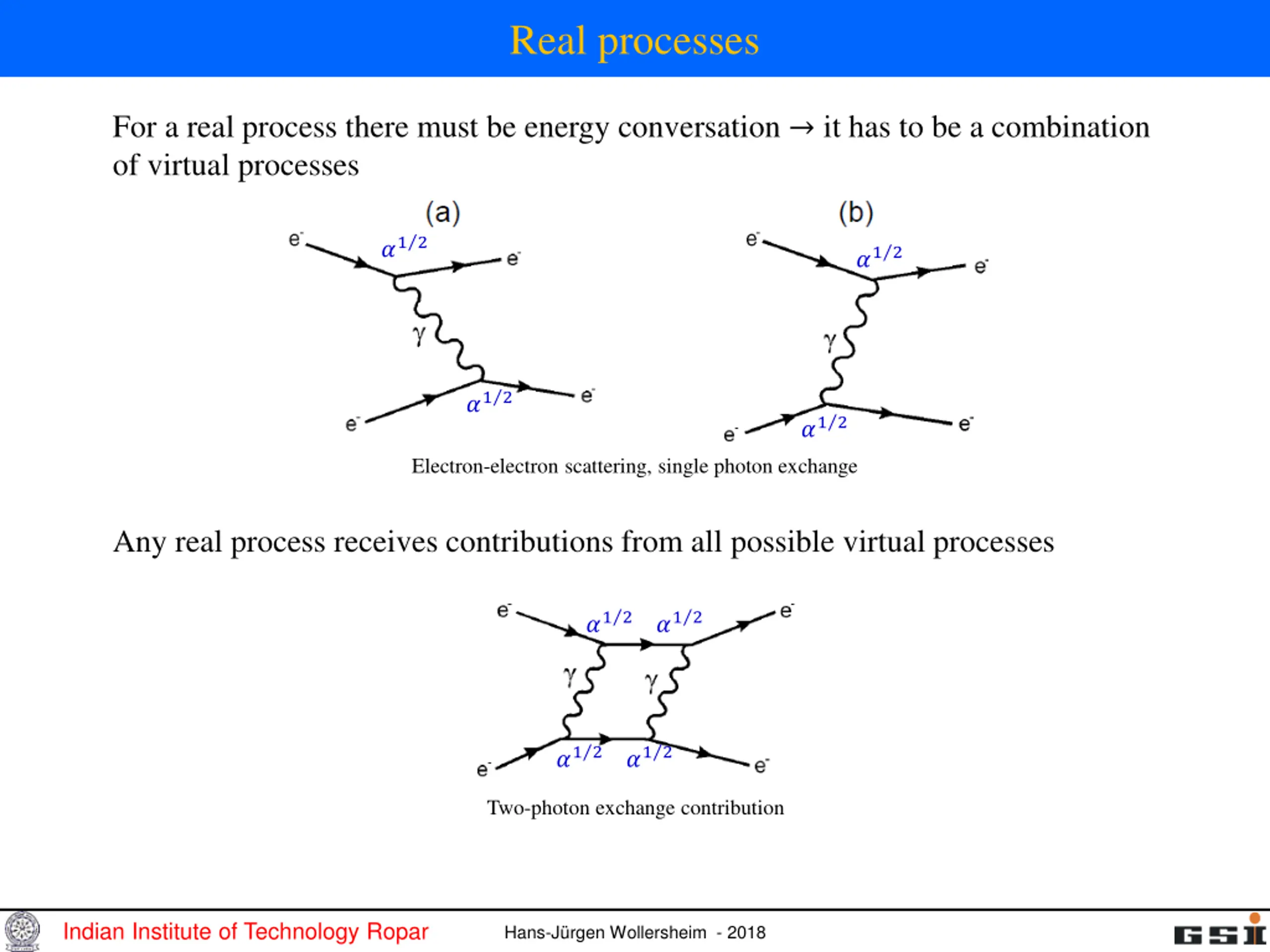 Real processes For a real process there must be energy conversation it has to be a combination of virtual processes ? 1 2 ? 1 2 ? 1 2 ? 1 2 Electron-electron scattering, single photon exchange Any real process receives contributions from all possible virtual processes ? ? 1 2 1 2 ? ? 1 2 1 2 Two-photon exchange contribution Indian Institute of Technology Ropar Hans-J rgen Wollersheim - 2018