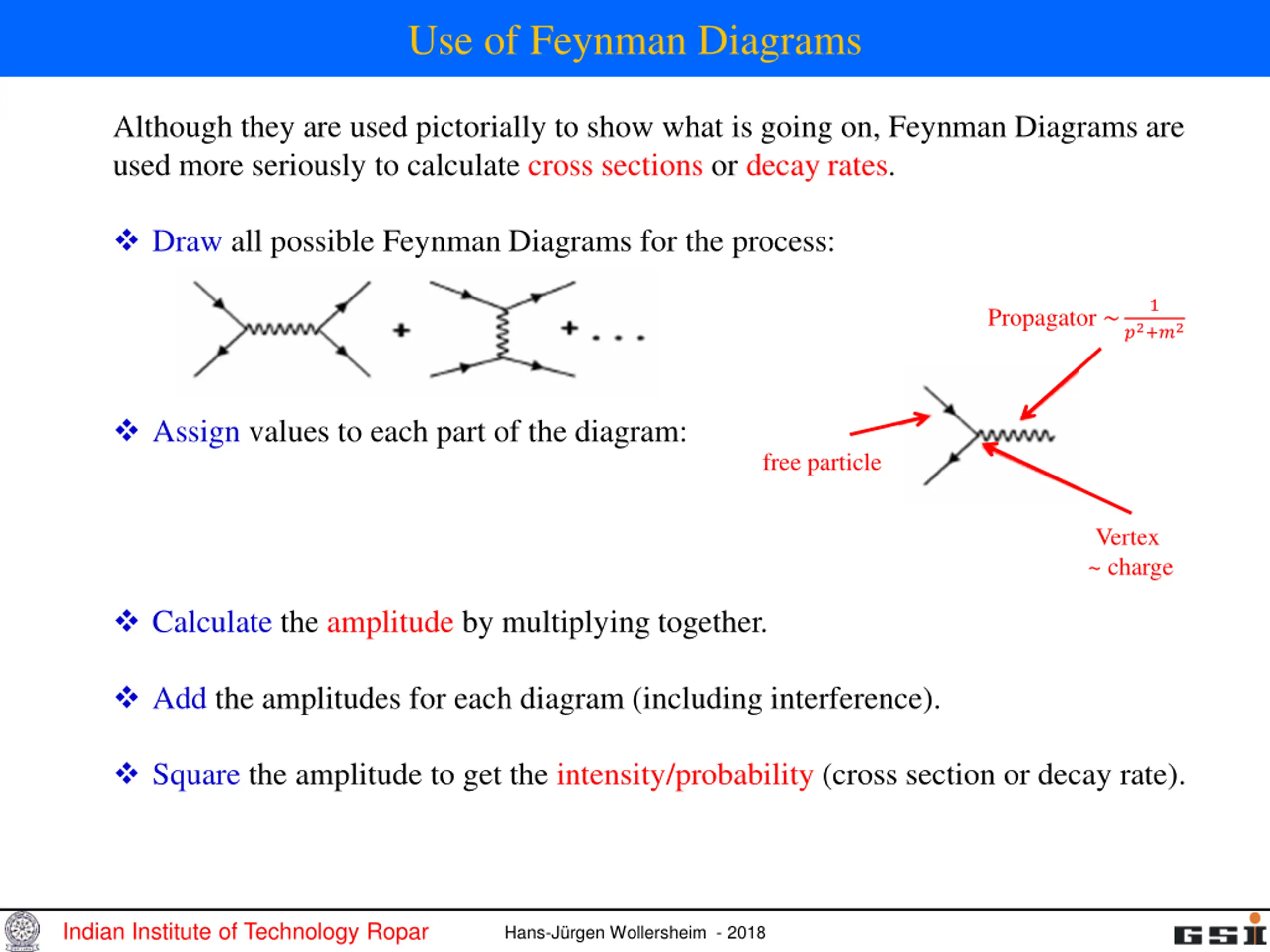 Use of Feynman Diagrams Although they are used pictorially to show what is going on, Feynman Diagrams are used more seriously to calculate cross sections or decay rates. Draw all possible Feynman Diagrams for the process: 1 Propagator ~ ?2+?2 Assign values to each part of the diagram: free particle Vertex ~ charge Calculate the amplitude by multiplying together. Add the amplitudes for each diagram (including interference). Square the amplitude to get the intensity/probability (cross section or decay rate). Indian Institute of Technology Ropar Hans-J rgen Wollersheim - 2018