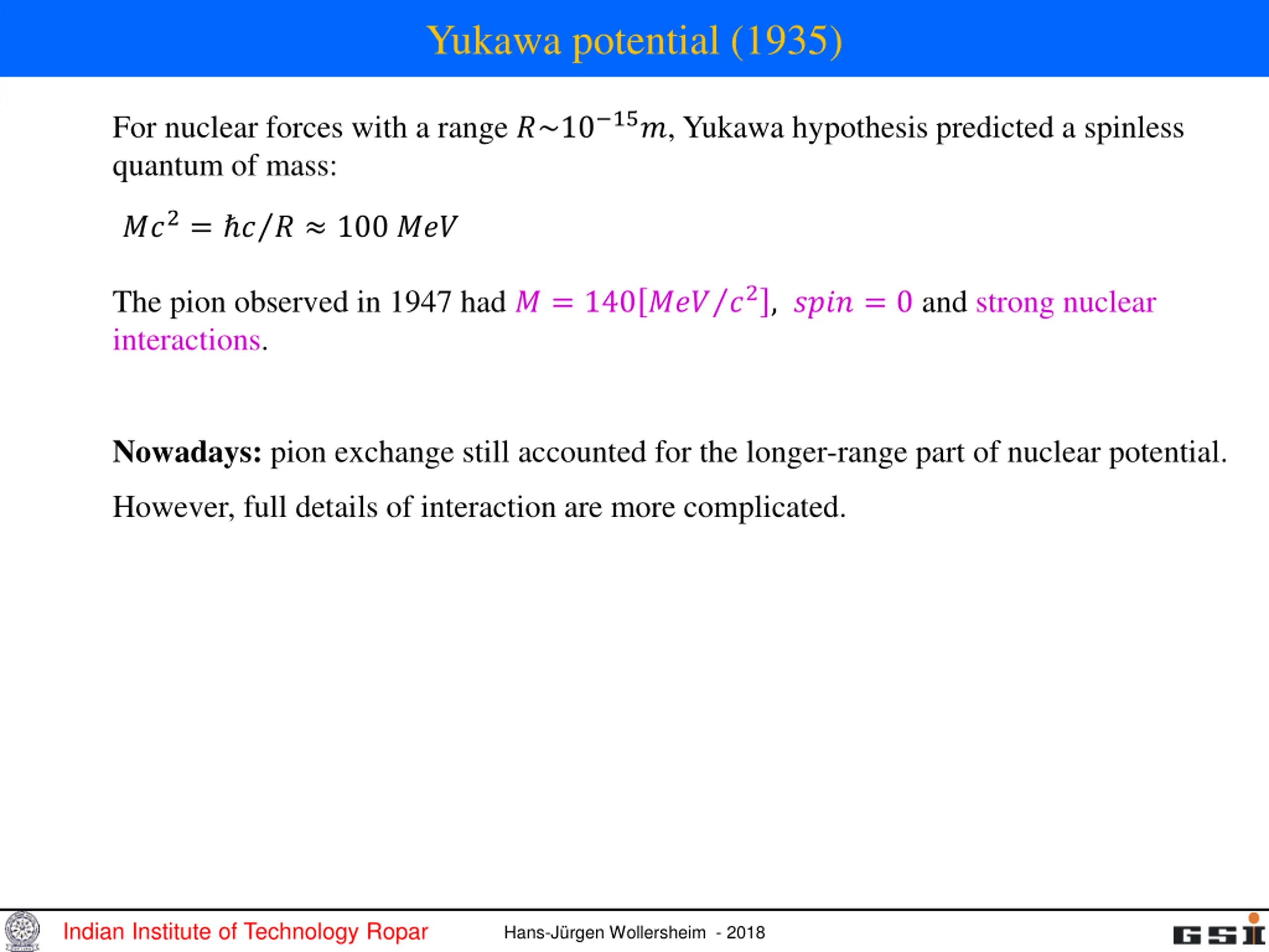 Yukawa potential (1935) For nuclear forces with a range ?~10 15?, Yukawa hypothesis predicted a spinless quantum of mass: ??2= ? ? 100 ??? ??? ?2, ???? = 0 and strong nuclear The pion observed in 1947 had ? = 140 interactions. Nowadays: pion exchange still accounted for the longer-range part of nuclear potential. However, full details of interaction are more complicated. Indian Institute of Technology Ropar Hans-J rgen Wollersheim - 2018